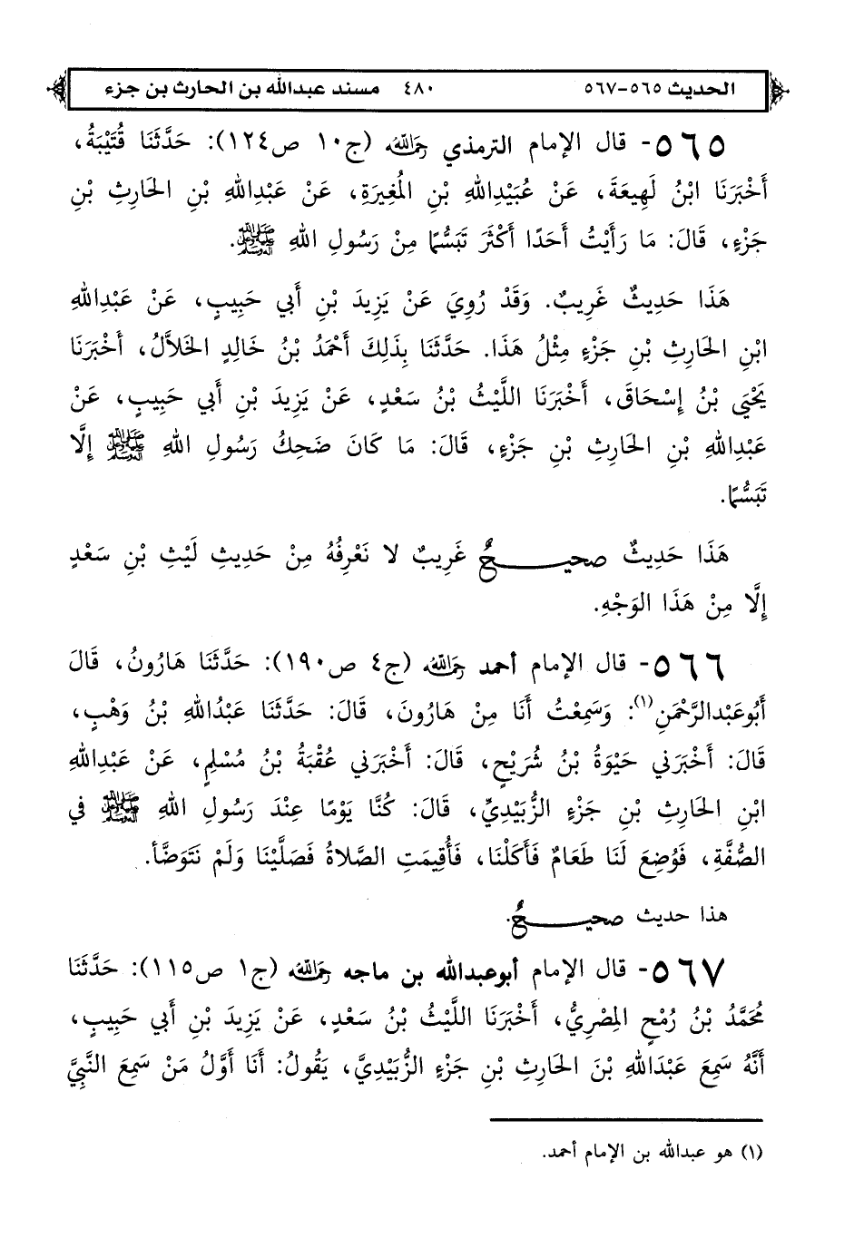 566 - قال الإمام أحمد رحمه الله (ج 4 ص 190): حَدَّثَنَا هَارُونُ -قَالَ أَبُو عَبْدِ الرَّحْمَنِ (1): وَسَمِعْتُ أَنَا مِنْ هَارُونَ-، قال: حَدَّثَنَا عَبْدُ اللهِ بْنُ وَهْبٍ، قَالَ: أَخْبَرَنِي حَيْوَةُ بْنُ شُرَيْحٍ، قَالَ: أَخْبَرَنِي عُقْبَةُ بْنُ مُسْلِمٍ، عَنْ عَبْدِ اللهِ بْنِ الْحَارِثِ بْنِ جَزْءٍ الزُّبَيْدِيِّ، قَالَ: كُنَّا يَوْمًا عِنْدَ رَسُولِ اللهِ صَلَّى اللهُ عَلَيْهِ وَعَلَى آلِهِ وَسَلَّمَ فِي الصُّفَّةِ، فَوُضِعَ لَنَا طَعَامٌ فَأَكَلْنَا، فَأُقِيمَتِ الصَّلَاةُ فَصَلَّيْنَا وَلَمْ نَتَوَضَّأْ».