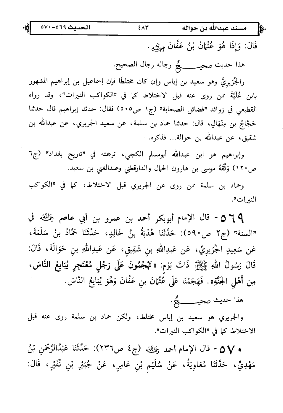569 - قال الإمام أبو بكر أحمد بن عمرو بن أبي عاصم رحمه الله في "السنة" (ج 2 ص 590): حدثنا هُدْبَةُ بْنُ خَالِدٍ، حدثنا حَمَّادُ بْنُ سَلَمَةَ، عَنْ سَعِيدٍ الْجُرَيْرِيِّ، عَنْ عَبْدِ اللهِ بْنِ شَقِيقٍ، عَنْ عَبْدِ اللهِ بْنِ حَوَالَةَ، قَالَ: قَالَ رَسُولُ اللهِ صَلَّى اللهُ عَلَيْهِ وَعَلَى آلِهِ وَسَلَّمَ ذَاتَ يَوْمٍ: «تَهْجِمُونَ عَلَى رَجُلٍ مُعْتَجِرٍ يُبَايِعُ النَّاسَ، مِنْ أَهْلِ الْجَنَّةِ». فَهَجَمْنَا عَلَى عُثْمَانَ بْنِ عَفَّانَ وَهُوَ يُبَايِعُ النَّاسَ.