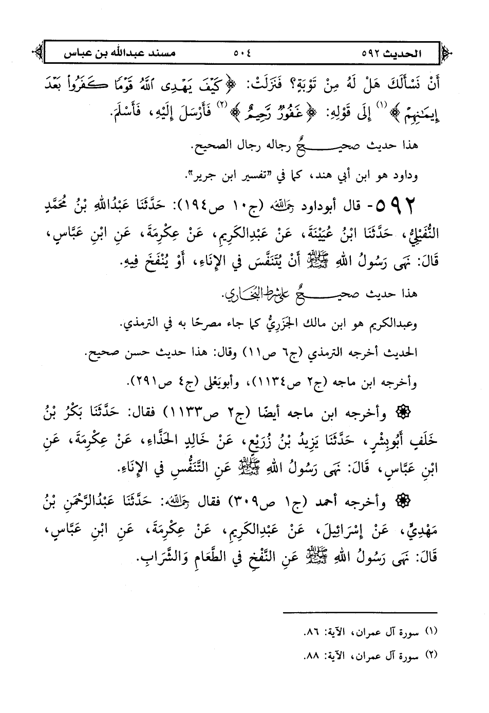 592 - قال أبو داود رحمه الله (ج 10 ص 194): حدثنا عبد الله بن محمد النفيلي حدثنا ابن عيينة عن عبد الكريم عن عكرمة عن ابن عباس قال: نهى رسول الله صلى الله عليه وعلى آله وسلم أن يتنفس في الإناء أو ينفخ فيه.