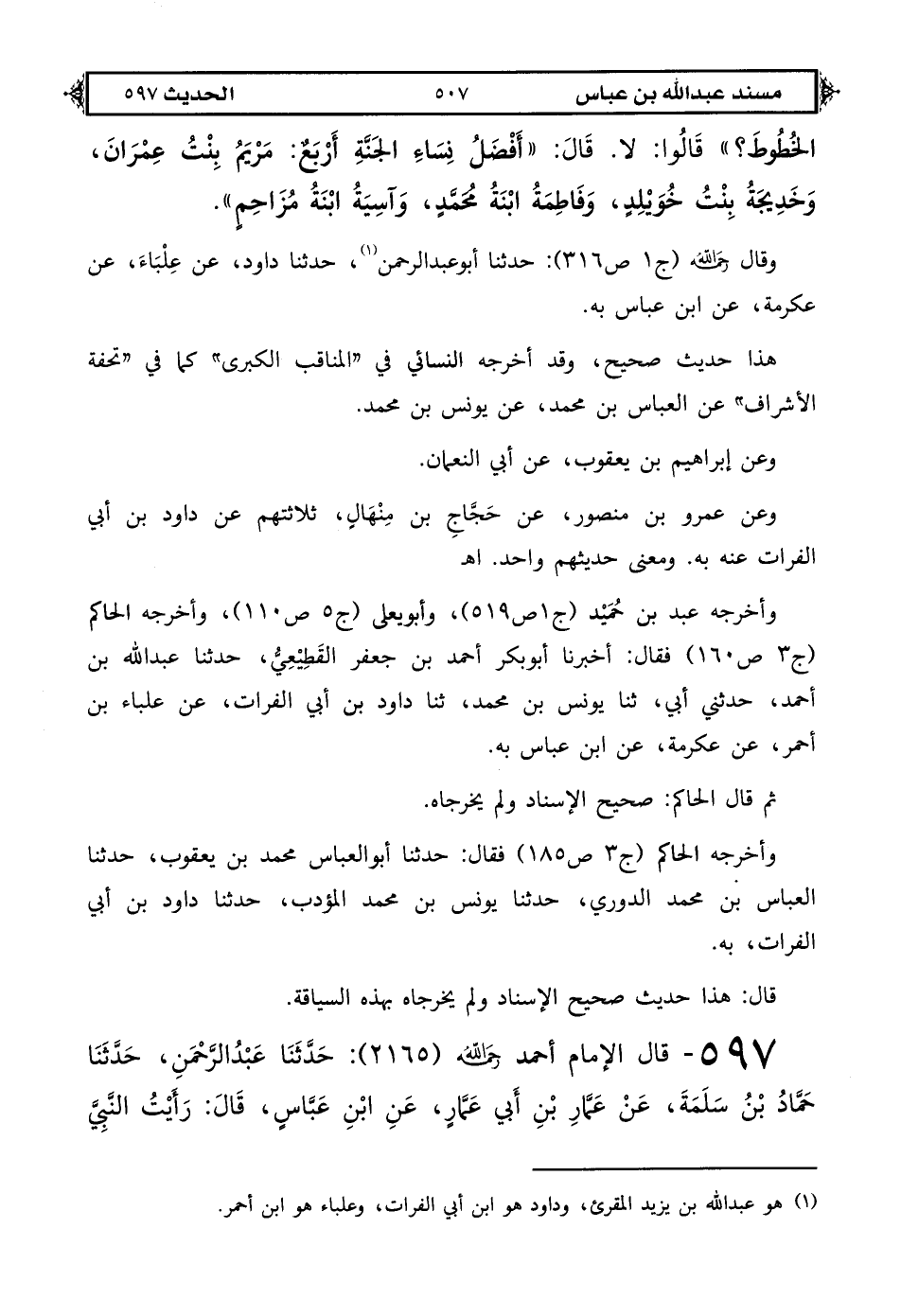 597 - قال الإمام أحمد رحمه الله (2165): حدثنا عبد الرحمن حدثنا حماد بن سلمة عن عمار بن أبي عمار عن ابن عباس قال رأيت النبي [ص: 508] صلى الله عليه وعلى آله وسلم في المنام بنصف النهار أشعث أغبر معه قارورة فيها دم يلتقطه أو يتتبع فيها شيئًا قال قلت يا رسول الله ما هذا قال «دم الحسين وأصحابه لم أزل أتتبعه منذ اليوم». قال عمار: فحفظنا ذلك اليوم فوجدناه قتل ذلك اليوم.