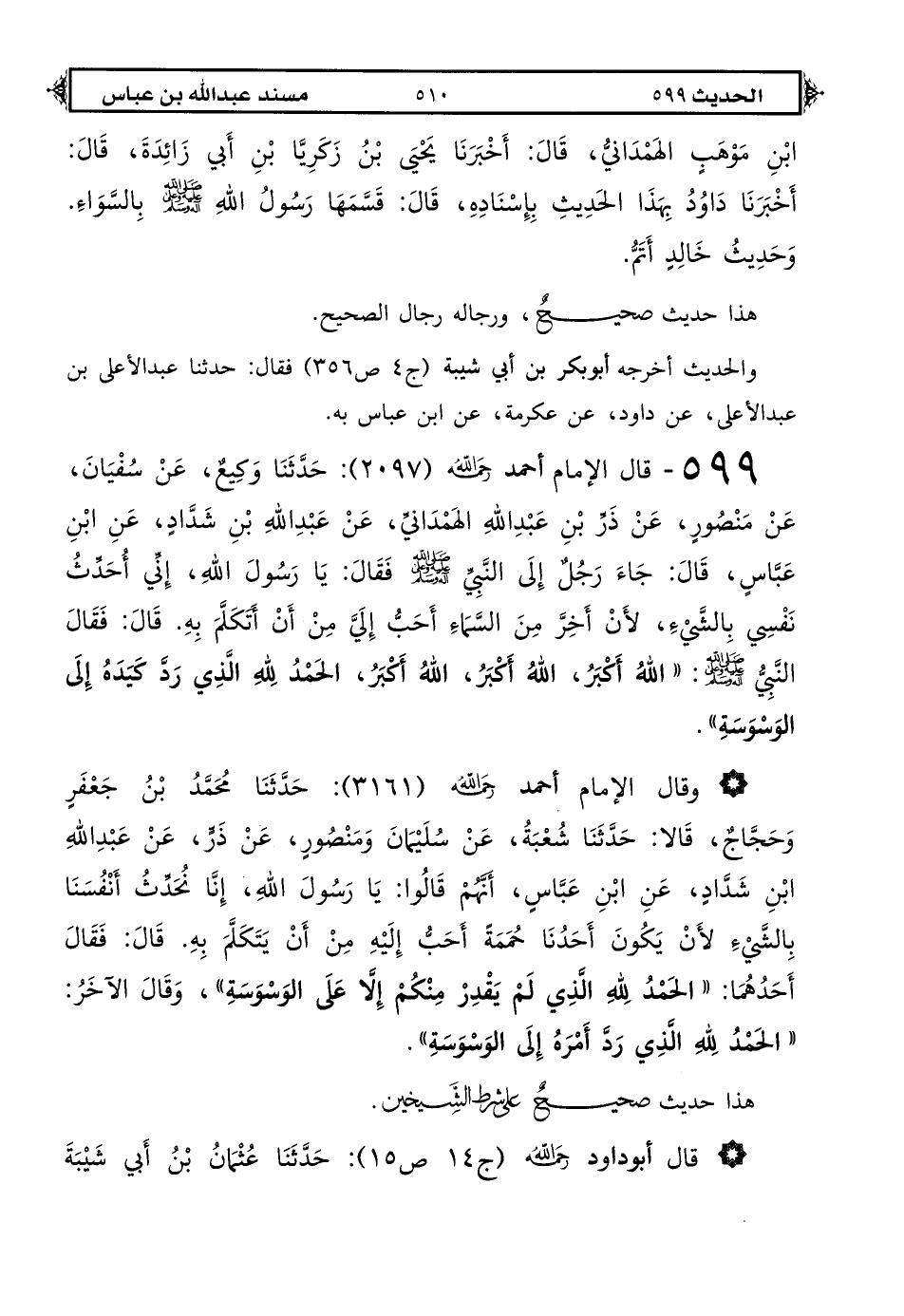 599 - قال الإمام أحمد رحمه الله (2097): حدثنا وكيع عن سفيان عن منصور عن ذر بن عبد الله الهمداني عن عبد الله بن شداد عن ابن عباس قال: جاء رجل إلى النبي صلى الله عليه وعلى آله وسلم فقال يا رسول الله إني أحدث نفسي بالشيء لأن أخر من السماء أحب إلي من أن أتكلم به قال فقال النبي صلى الله عليه وعلى آله وسلم «الله أكبر الله أكبر الله أكبر الحمد لله الذي رد كيده إلى الوسوسة».