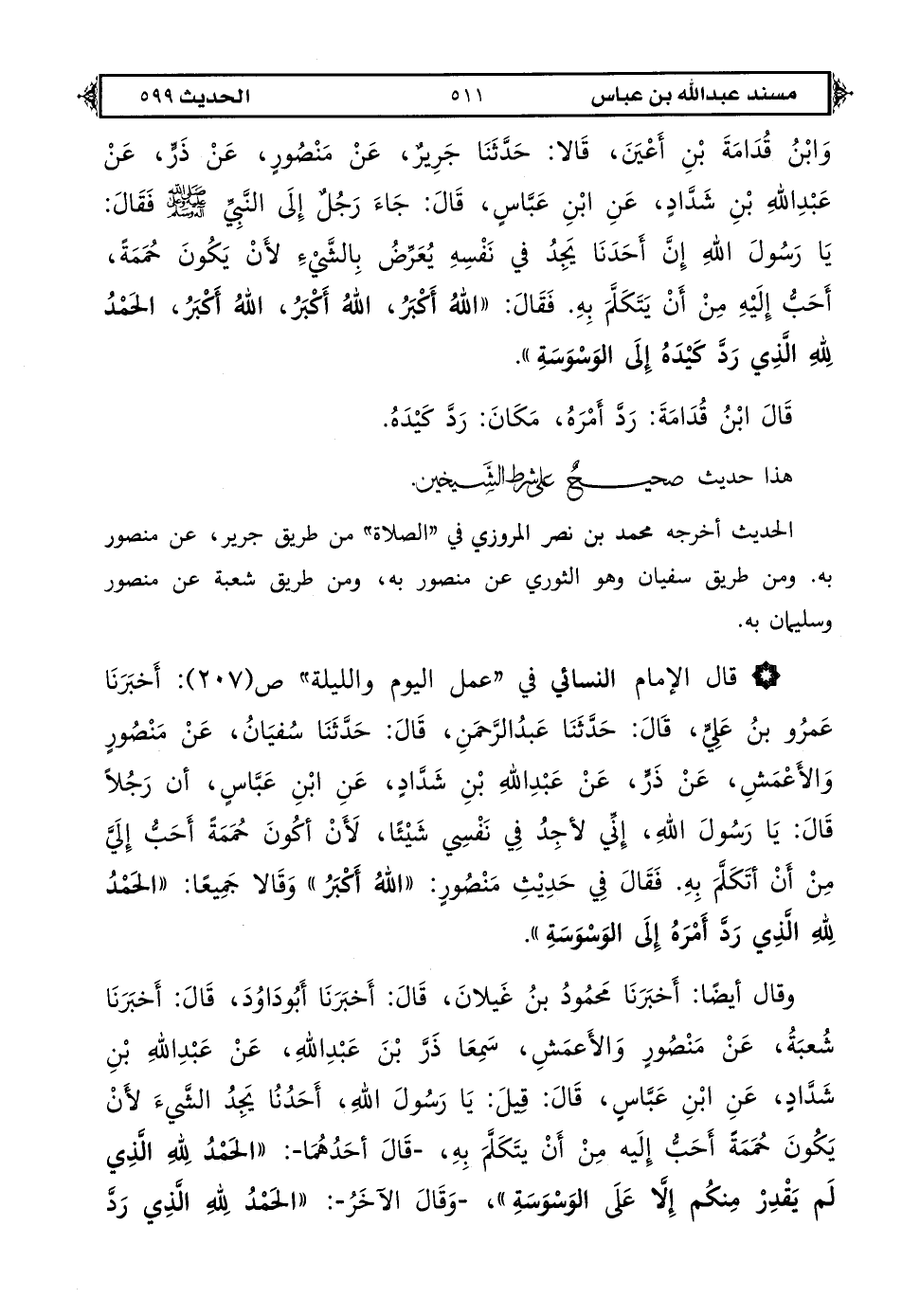 قال أبو عبد الرحمن: هذا حديث حسنٌ، رجاله رجال الصحيح، إلا الحارث بن عبد الرحمن، وقد قال النسائي: ليس به بأس، وقال أحمد بن حنبل: لا أرى به بأسًا.