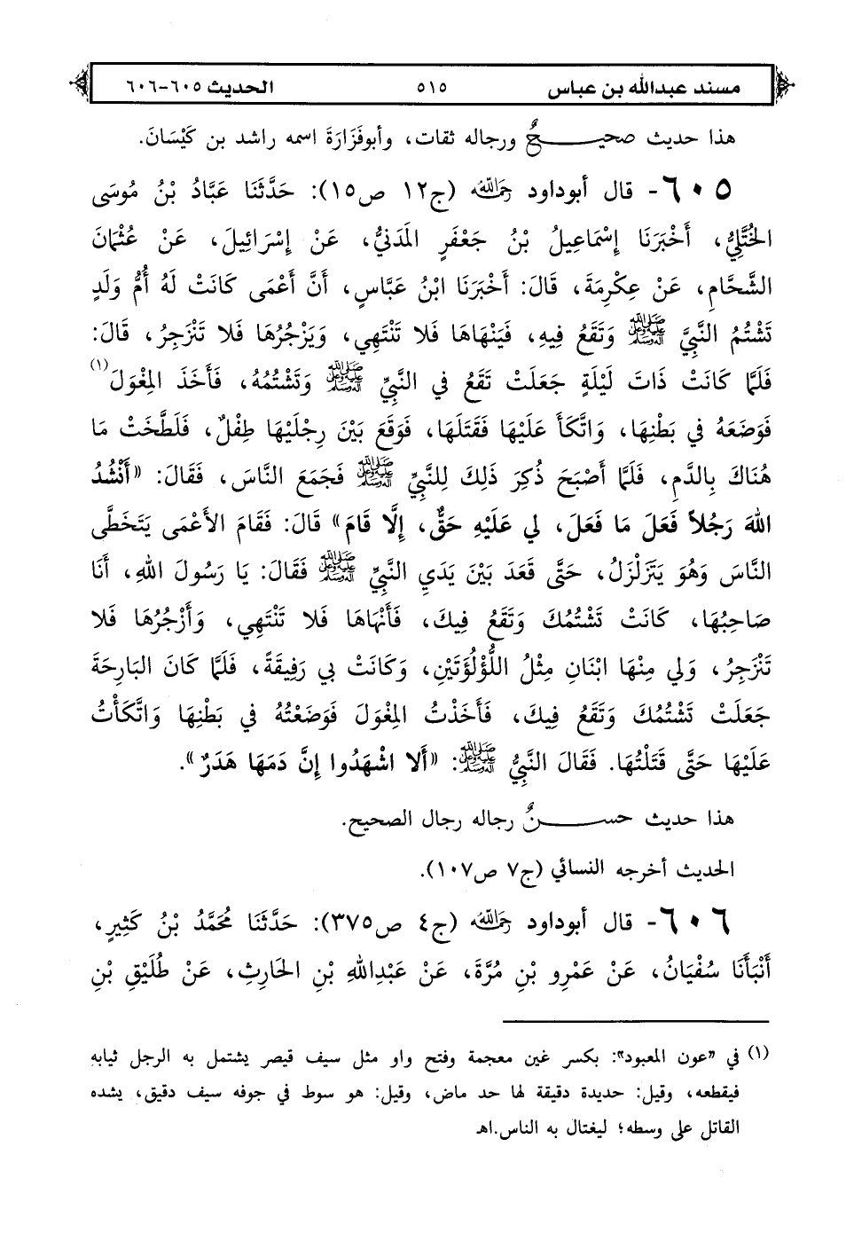 605 - قال أبو داود رحمه الله (ج 12 ص 15): حَدَّثَنَا عَبَّادُ بْنُ مُوسَى الْخُتَّلِيُّ أَخْبَرَنَا إِسْمَاعِيلُ بْنُ جَعْفَرٍ الْمَدَنِيُّ عَنْ إِسْرَائِيلَ عَنْ عُثْمَانَ الشَّحَّامِ عَنْ عِكْرِمَةَ قَالَ أخبرَنَا ابْنُ عَبَّاسٍ: أَنَّ أَعْمَى كَانَتْ لَهُ أُمُّ وَلَدٍ تَشْتُمُ النَّبِيَّ صَلَّى اللهُ عَلَيْهِ وَعَلَى آلِهِ وَسَلَّمَ وَتَقَعُ فِيهِ فَيَنْهَاهَا فَلَا تَنْتَهِي وَيَزْجُرُهَا فَلَا تَنْزَجِرُ قَالَ فَلَمَّا كَانَتْ ذَاتَ لَيْلَةٍ جَعَلَتْ تَقَعُ فِي النَّبِيِّ صَلَّى اللهُ عَلَيْهِ وَعَلَى آلِهِ وَسَلَّمَ وَتَشْتُمُهُ فَأَخَذَ الْمِغْوَلَ (1) فَوَضَعَهُ فِي بَطْنِهَا وَاتَّكَأَ عَلَيْهَا فَقَتَلَهَا فَوَقَعَ بَيْنَ رِجْلَيْهَا طِفْلٌ فَلَطَّخَتْ مَا هُنَاكَ بِالدَّمِ فَلَمَّا أَصْبَحَ ذُكِرَ ذَلِكَ لِلنَّبِيِّ صَلَّى اللهُ عَلَيْهِ وَعَلَى آلِهِ وَسَلَّمَ فَجَمَعَ النَّاسَ فَقَالَ «أَنْشُدُ اللهَ رَجُلًا فَعَلَ مَا فَعَلَ لِي عَلَيْهِ حَقٌّ إِلَّا قَامَ» قال فَقَامَ الْأَعْمَى يَتَخَطَّى النَّاسَ وَهُوَ يَتَزَلْزَلُ حَتَّى قَعَدَ بَيْنَ يَدَيْ النَّبِيِّ صَلَّى اللهُ عَلَيْهِ وَعَلَى آلِهِ وَسَلَّمَ فَقَالَ يَا رَسُولَ اللهِ أَنَا صَاحِبُهَا كَانَتْ تَشْتُمُكَ وَتَقَعُ فِيكَ فَأَنْهَاهَا فَلَا تَنْتَهِي وَأَزْجُرُهَا فَلَا تَنْزَجِرُ وَلِي مِنْهَا ابْنَانِ مِثْلُ اللُّؤْلُؤَتَيْنِ وَكَانَتْ بِي رَفِيقَةً فَلَمَّا كَانَ الْبَارِحَةَ جَعَلَتْ تَشْتُمُكَ وَتَقَعُ فِيكَ فَأَخَذْتُ الْمِغْوَلَ فَوَضَعْتُهُ فِي بَطْنِهَا وَاتَّكَأْتُ عَلَيْهَا حَتَّى قَتَلْتُهَا فَقَالَ النَّبِيُّ صَلَّى اللهُ عَلَيْهِ وَعَلَى آلِهِ وَسَلَّمَ «أَلَا اشْهَدُوا إِنَّ دَمَهَا هَدَرٌ».
