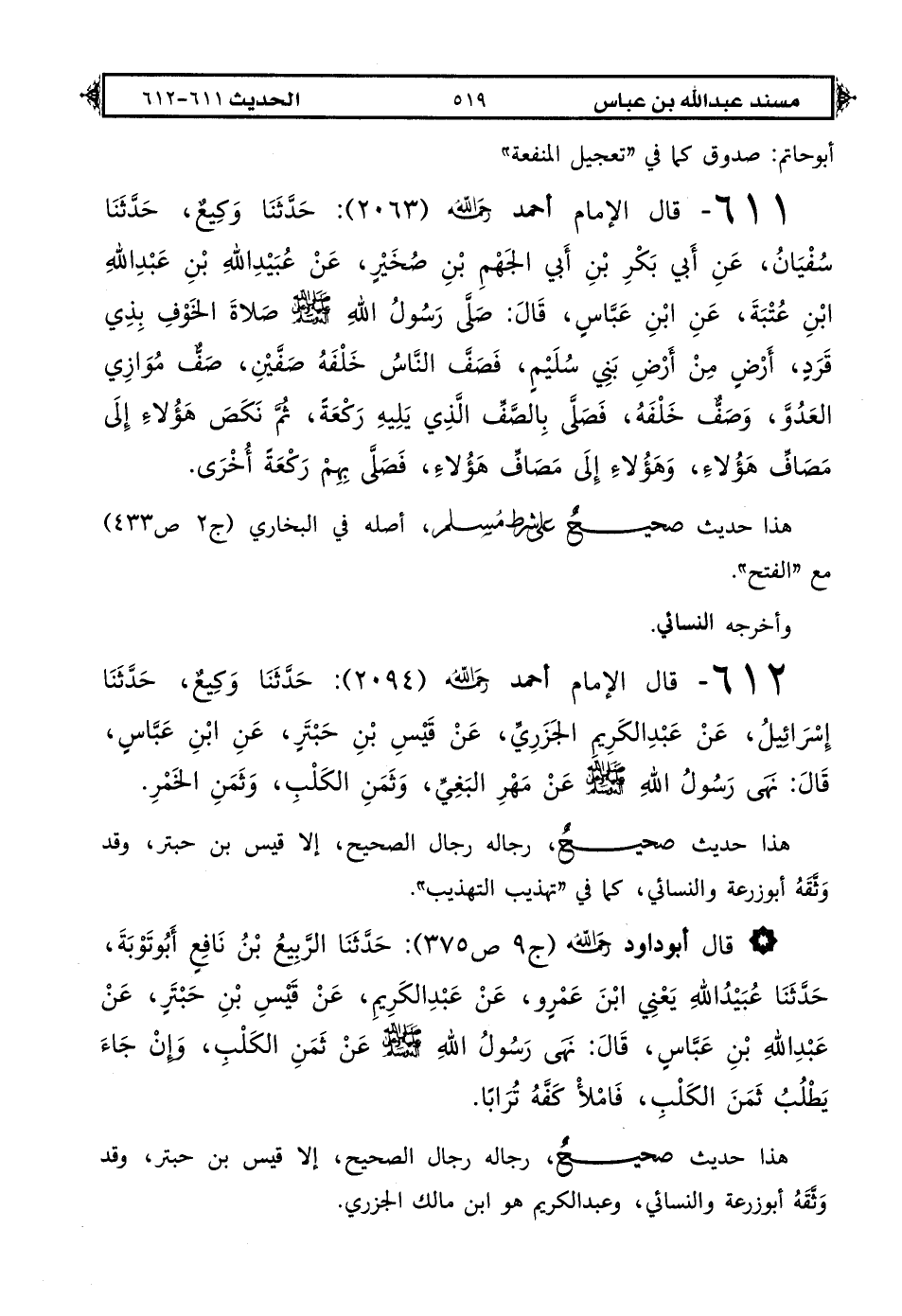 612 - قال الإمام أحمد رحمه الله (2094): حَدَّثَنَا وَكِيعٌ حَدَّثَنَا إِسْرَائِيلُ عَنْ عَبْدِ الْكَرِيمِ الْجَزَرِيِّ عَنْ قَيْسِ بْنِ حَبْتَرٍ عَنِ ابْنِ عَبَّاسٍ قَالَ: نَهَى رَسُولُ اللهِ صَلَّى اللهُ عَلَيْهِ وَعَلَى آلِهِ وَسَلَّمَ عَنْ مَهْرِ الْبَغِيِّ وَثَمَنِ الْكَلْبِ وَثَمَنِ الْخَمْرِ.