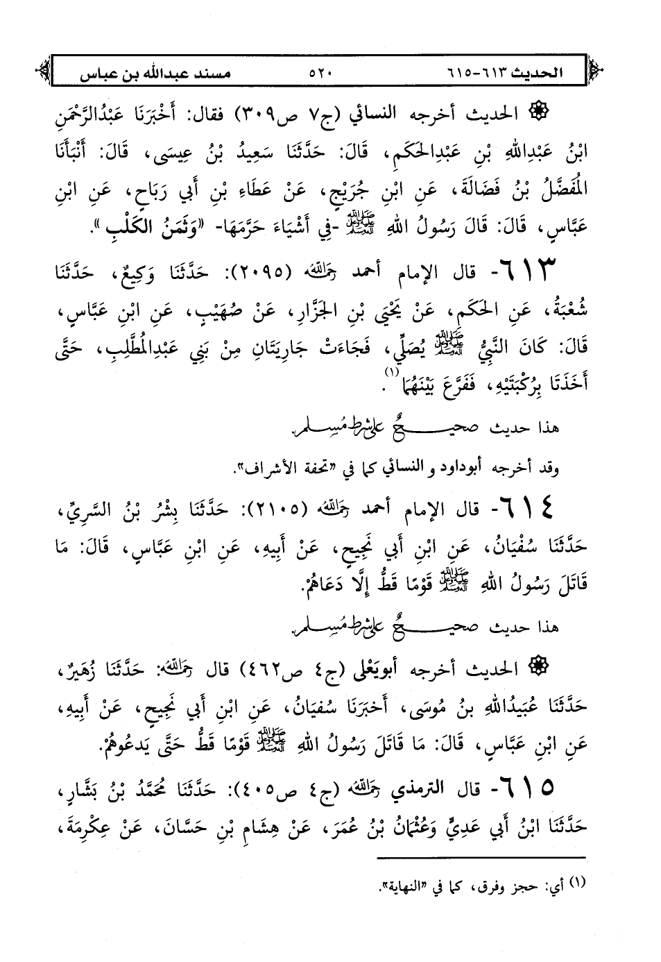 613 - قال الإمام أحمد رحمه الله (2095): حَدَّثَنَا وَكِيعٌ حَدَّثَنَا شُعْبَةُ عَنِ الْحَكَمِ عَنْ يَحْيَى بْنِ الْجَزَّارِ عَنْ صُهَيْبٍ عَنِ ابْنِ عَبَّاسٍ قَالَ: كَانَ النَّبِيُّ صَلَّى اللهُ عَلَيْهِ وَعَلَى آلِهِ وَسَلَّمَ يُصَلِّي فَجَاءَتْ جَارِيَتَانِ مِنْ بَنِي عَبْدِ الْمُطَّلِبِ حَتَّى أَخَذَتَا بِرُكْبَتَيْهِ فَفَرَّعَ بَيْنَهُمَا (1).