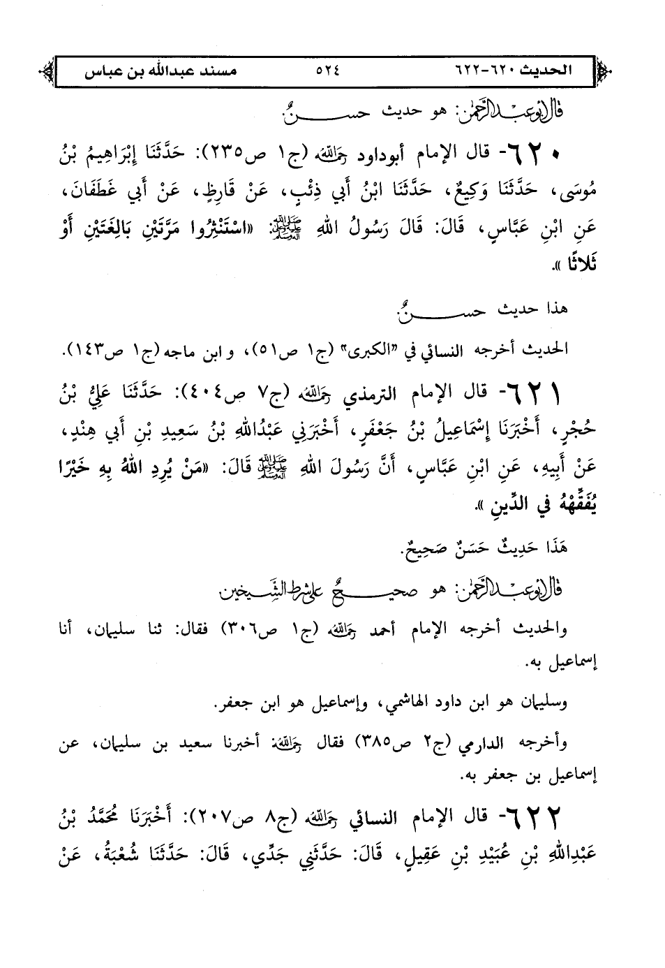 621 - قال الإمام الترمذي رحمه الله (ج 7 ص 404): حَدَّثَنَا عَلِيُّ بْنُ حُجْرٍ أخبرَنَا إِسْمَاعِيلُ بْنُ جَعْفَرٍ أخبرَنِي عَبْدُ اللهِ بْنُ سَعِيدِ بْنِ أَبِي هِنْدٍ عَنْ أَبِيهِ عَنْ ابْنِ عَبَّاسٍ: أَنَّ رَسُولَ اللهِ صَلَّى اللهُ عَلَيْهِ وَعَلَى آلِهِ وَسَلَّمَ قَالَ «مَنْ يُرِدْ اللهُ بِهِ خَيْرًا يُفَقِّهْهُ فِي الدِّينِ».