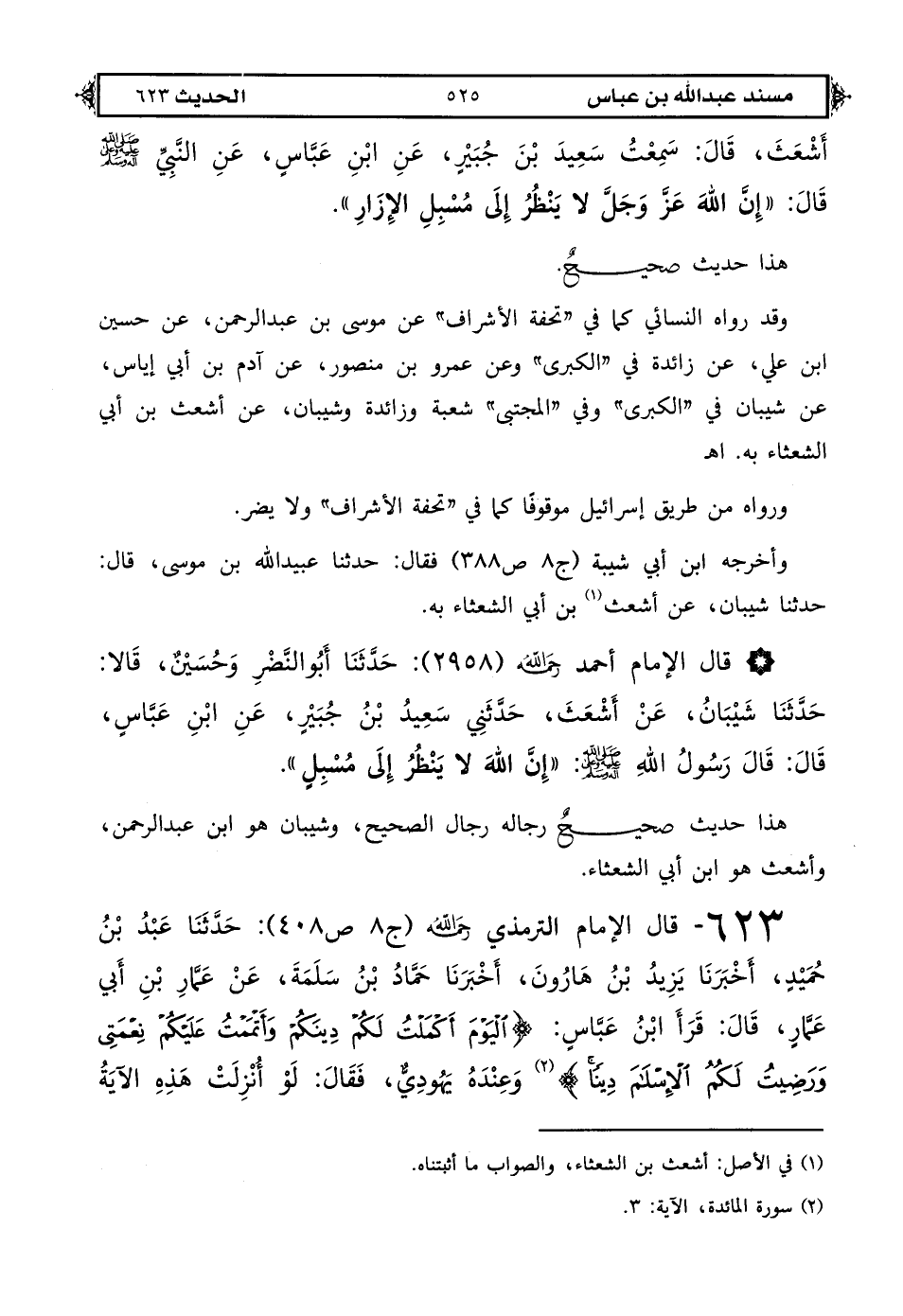 623 - قال الإمام الترمذي رحمه الله (ج 8 ص 408): حَدَّثَنَا عَبْدُ بْنُ حُمَيْدٍ أَخْبَرَنَا يَزِيدُ بْنُ هَارُونَ أَخْبَرَنَا حَمَّادُ بْنُ سَلَمَةَ عَنْ عَمَّارِ بْنِ أَبِي عَمَّارٍ قَالَ: قَرَأَ ابْنُ عَبَّاسٍ {الْيَوْمَ أَكْمَلْتُ لَكُمْ دِينَكُمْ وَأَتْمَمْتُ عَلَيْكُمْ نِعْمَتِي وَرَضِيتُ لَكُمْ الْإِسْلَامَ دِينًا} (1) وَعِنْدَهُ يَهُودِيٌّ فَقَالَ لَوْ أُنْزِلَتْ هَذِهِ الْآيَةُ [ص: 526] عَلَيْنَا لَاتَّخَذْنَا يَوْمَهَا عِيدًا قَالَ ابْنُ عَبَّاسٍ: فَإِنَّهَا نَزَلَتْ فِي يَوْمِ عِيدَيْنِ فِي يَوْمِ جُمْعَةٍ وَيَوْمِ عَرَفَةَ.