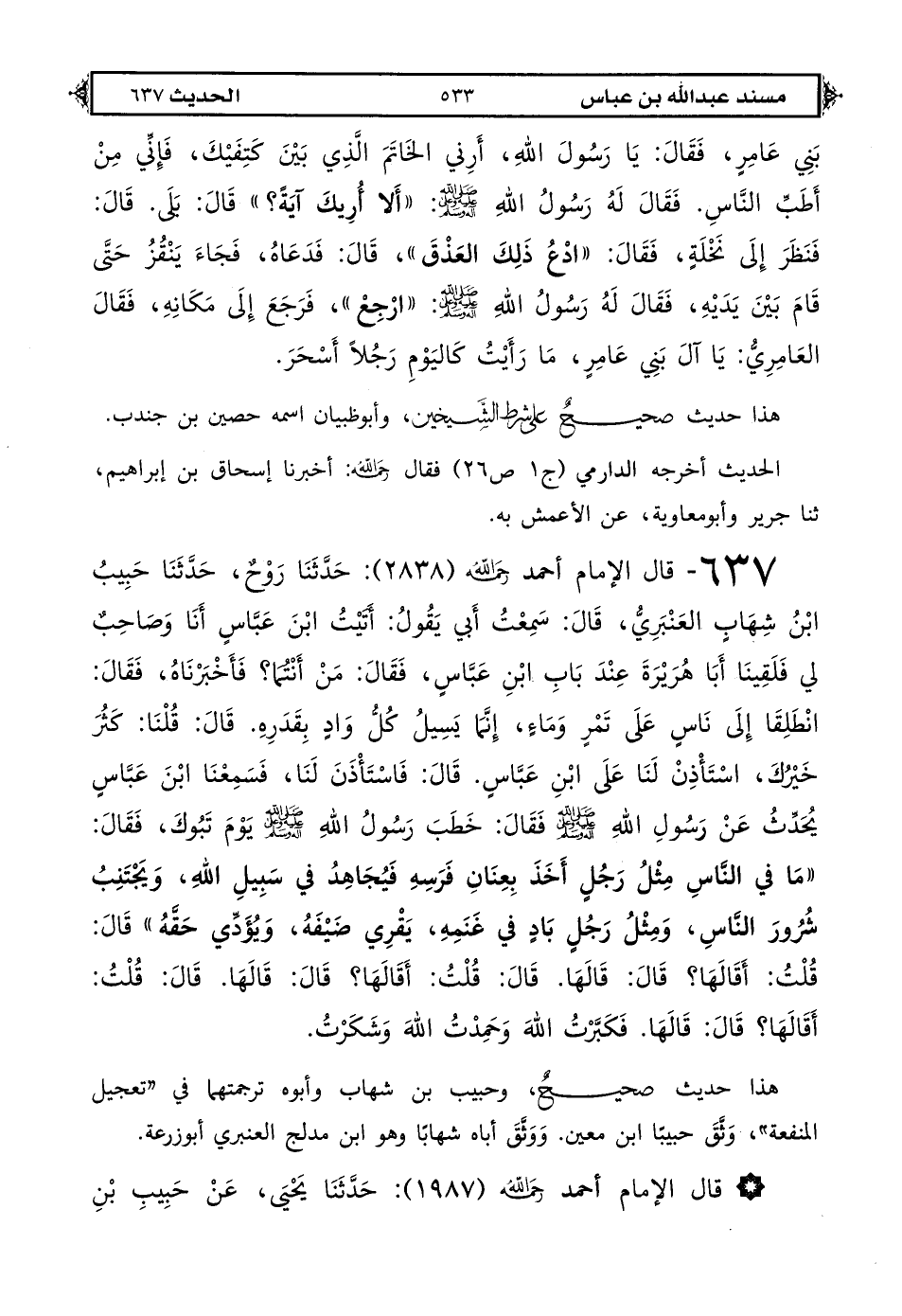 637 - قال الإمام أحمد رحمه الله (2838): حدثنا روح حدثنا حبيب بن شهاب العنبري قال سمعت أبي يقول: أتيت ابن عباس أنا وصاحب لي فلقينا أبا هريرة عند باب ابن عباس فقال من أنتما فأخبرناه فقال انطلقا إلى ناس على تمر وماء إنما يسيل كل واد بقدره قال قلنا كثر خيرك استأذن لنا على ابن عباس قال فاستأذن لنا فسمعنا ابن عباس يحدث عن رسول الله صلى الله عليه وعلى آله وسلم فقال: خطب رسول الله صلى الله عليه وعلى آله وسلم يوم تبوك فقال «ما في الناس مثل رجل أخذ بعنان فرسه فيجاهد في سبيل الله ويجتنب شرور الناس ومثل رجل باد في غنمه يقري ضيفه ويؤدي حقه» قال قلت أقالها قال قالها قال قلت أقالها قال قالها قال قلت أقالها قال قالها فكبرت الله وحمدت الله وشكرت.