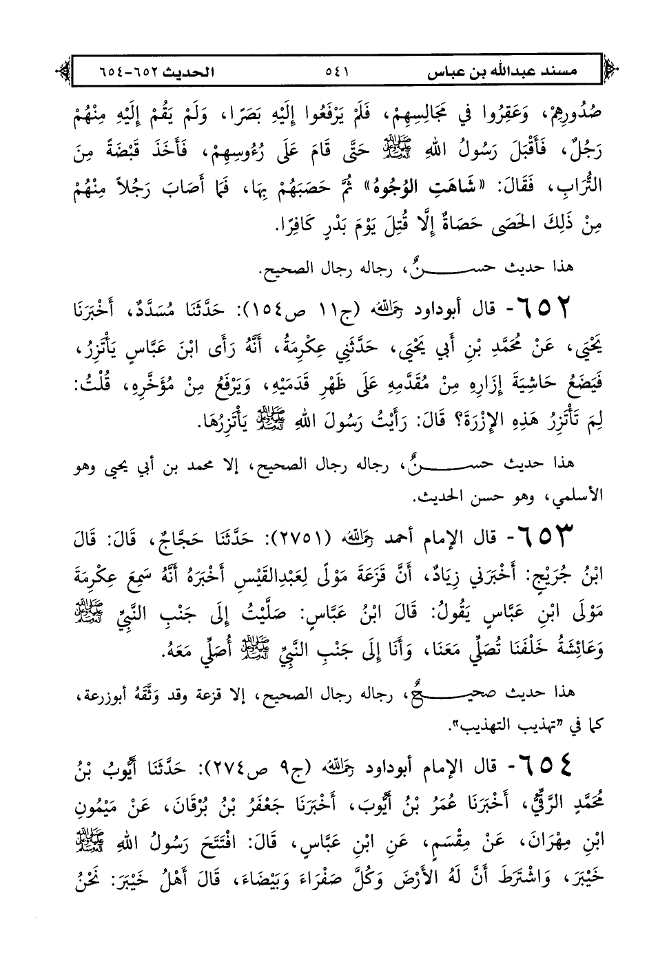 652 - قال أبو داود رحمه الله (ج 11 ص 154): حَدَّثَنَا مُسَدَّدٌ أخبرَنَا يَحْيَى عَنْ مُحَمَّدِ بْنِ أَبِي يَحْيَى قَالَ حَدَّثَنِي عِكْرِمَةُ: أَنَّهُ رَأَى ابْنَ عَبَّاسٍ يَأْتَزِرُ فَيَضَعُ حَاشِيَةَ إِزَارِهِ مِنْ مُقَدَّمِهِ عَلَى ظَهْرِ قَدَمَيْهِ وَيَرْفَعُ مِنْ مُؤَخَّرِهِ قُلْتُ لِمَ تَأْتَزِرُ هَذِهِ الْإِزْرَةَ قَالَ رَأَيْتُ رَسُولَ اللهِ صَلَّى اللهُ عَلَيْهِ وَعَلَى آلِهِ وَسَلَّمَ يَأْتَزِرُهَا.