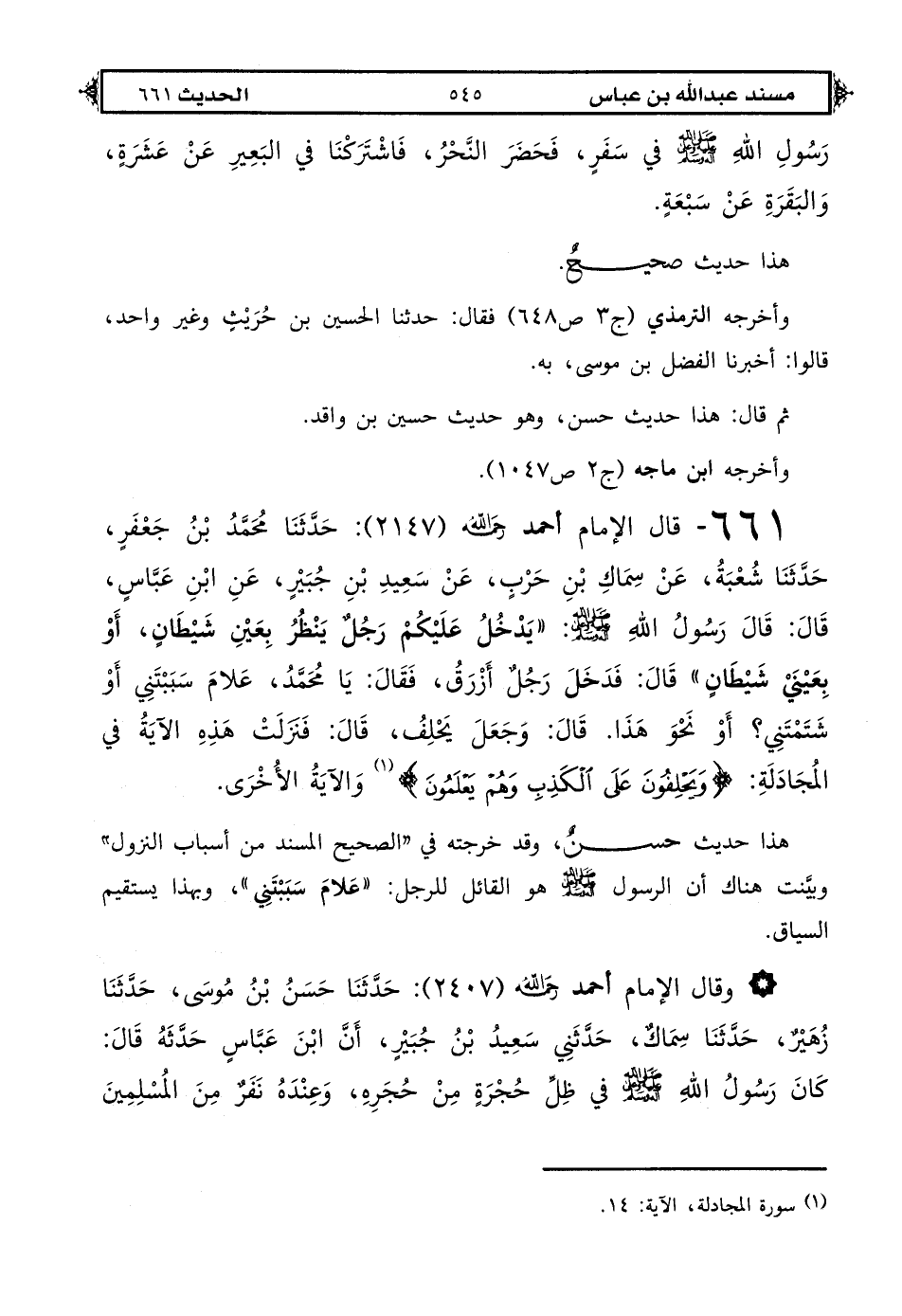 661 - قال الإمام أحمد رحمه الله (2147): حدثنا محمد بن جعفر حدثنا شعبة عن سماك بن حرب عن سعيد بن جبير عن ابن عباس قال: قال رسول الله صلى الله عليه وعلى آله وسلم «يدخل عليكم رجل ينظر بعين شيطان -أو بعيني شيطان-» قال فدخل رجل أزرق فقال يا محمد علام سببتني -أو شتمتنى أو نحو هذا- قال وجعل يحلف قال فنزلت هذه الآية في المجادلة {ويحلفون على الكذب وهم يعلمون} (1) والآية الأخرى.