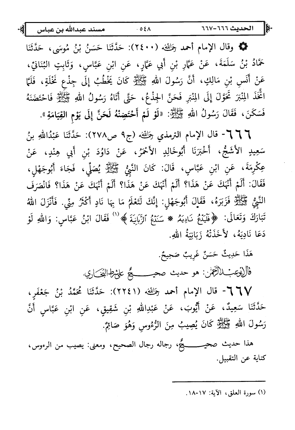 666 - قال الإمام الترمذي رحمه الله (ج 9 ص 278): حَدَّثَنَا عبد الله بن سَعِيدٍ الْأَشَجُّ أخبرَنَا أَبُو خَالِدٍ الْأَحْمَرُ عَنْ دَاوُدَ بْنِ أَبِي هِنْدٍ عَنْ عِكْرِمَةَ عَنْ ابْنِ عَبَّاسٍ قَالَ: كَانَ النَّبِيُّ صَلَّى اللهُ عَلَيْهِ وَعَلَى آلِهِ وَسَلَّمَ يُصَلِّي فَجَاءَ أَبُو جَهْلٍ فَقَالَ أَلَمْ أَنْهَكَ عَنْ هَذَا أَلَمْ أَنْهَكَ عَنْ هَذَا أَلَمْ أَنْهَكَ عَنْ هَذَا فَانْصَرَفَ النَّبِيُّ صَلَّى اللهُ عَلَيْهِ وَعَلَى آلِهِ وَسَلَّمَ فَزَبَرَهُ فَقَالَ أَبُو جَهْلٍ إِنَّكَ لَتَعْلَمُ مَا بِهَا نَادٍ أَكْثَرُ مِنِّي فَأَنْزَلَ اللهُ تبارك وتعالى {فَلْيَدْعُ نَادِيَهُ • سَنَدْعُ الزَّبَانِيَةَ} (1) فَقَالَ ابْنُ عَبَّاسٍ وَاللهِ لَوْ دَعَا نَادِيَهُ لَأَخَذَتْهُ زَبَانِيَةُ اللهِ.