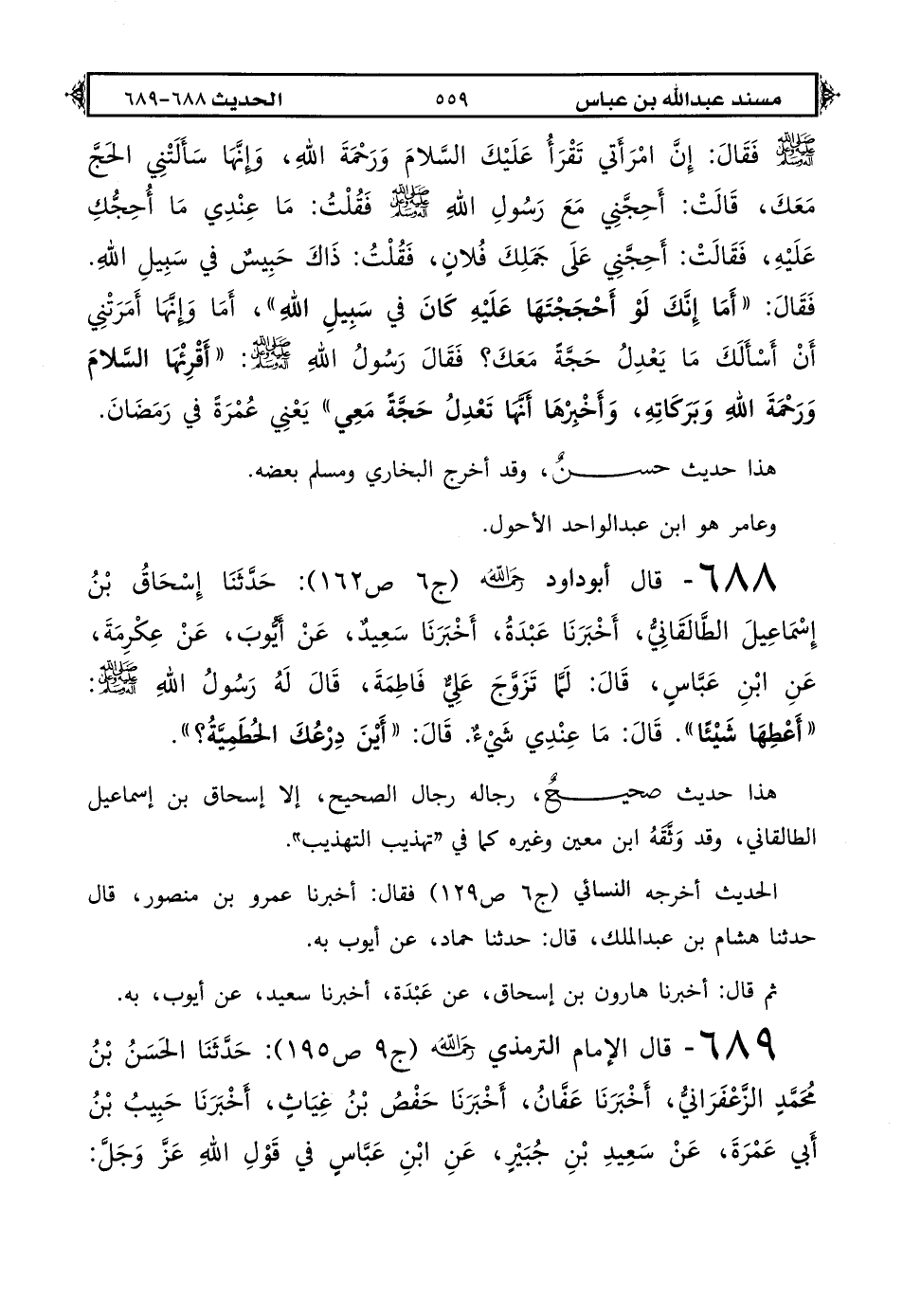 688 - قال أبو داود رحمه الله (ج 6 ص 162): حدثنا إسحاق بن إسماعيل الطالقاني أخبرنا عبدة أخبرنا سعيد عن أيوب عن عكرمة عن ابن عباس قال: لما تزوج علي فاطمة قال له رسول الله صلى الله عليه وعلى آله وسلم «أعطها شيئًا» قال ما عندي شيء قال «أين درعك الحطمية؟ ».