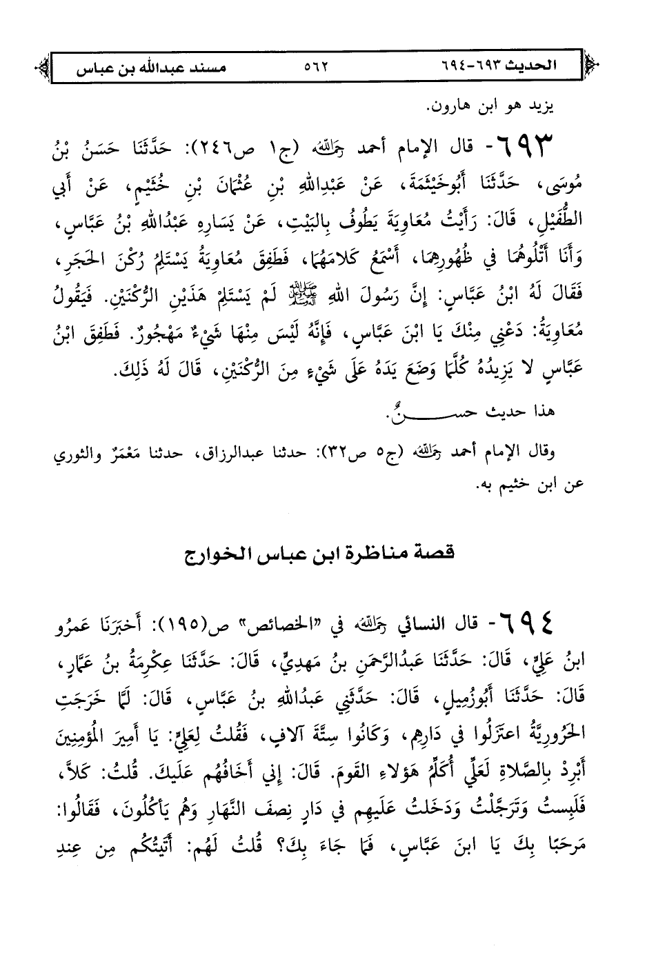 693 - قال الإمام أحمد رحمه الله (ج 1 ص 246): حدثنا حسن بن موسى حدثنا أبو خيثمة عن عبد الله بن عثمان بن خثيم عن أبي الطفيل قال: رأيت معاوية يطوف بالبيت عن يساره عبد الله بن عباس وأنا أتلوهما في ظهورهما أسمع كلامهما فطفق معاوية يستلم ركن الحجر فقال له ابن عباس: إن رسول الله صلى الله عليه وعلى آله وسلم لم يستلم هذين الركنين فيقول معاوية دعني منك يا ابن عباس فإنه ليس منها شيء مهجور فطفق ابن عباس لا يزيده كلما وضع يده على شيء من الركنين قال له ذلك.