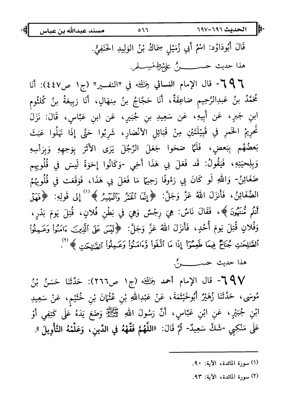 696 - قال الإمام النسائي في "التفسير" (ج 1 ص 447): أنا محمد بن عبد الرحيم صاعقة أنا حجاج بن منهال أنا ربيعة بن كلثوم بن جبر عن أبيه عن سعيد بن جبير عن ابن عباس قال: نزل تحريم الخمر في قبيلتين من قبائل الأنصار شربوا حتى إذا نهلوا عبث بعضهم ببعض فلما صحوا جعل الرجل يرى الأثر بوجهه وبرأسه وبلحيته فيقول قد فعل بي هذا أخي -وكانوا إخوة ليس في قلوبهم ضغائن- والله لو كان بي رءوفًا رحيمًا ما فعل بي هذا فوقعت في قلوبهم الضغائن فأنزل الله عز وجل {إنما الخمر والميسر} (1) إلى قوله {فهل أنتم منتهون} فقال ناس هي رجس وهي في بطن فلان قتل يوم بدر وفلان قتل يوم أحد فأنزل الله عز وجل: {ليس على الذين آمنوا وعملوا الصالحات جناح فيما طعموا إذا ما اتقوا وآمنوا وعملوا الصالحات} (2).