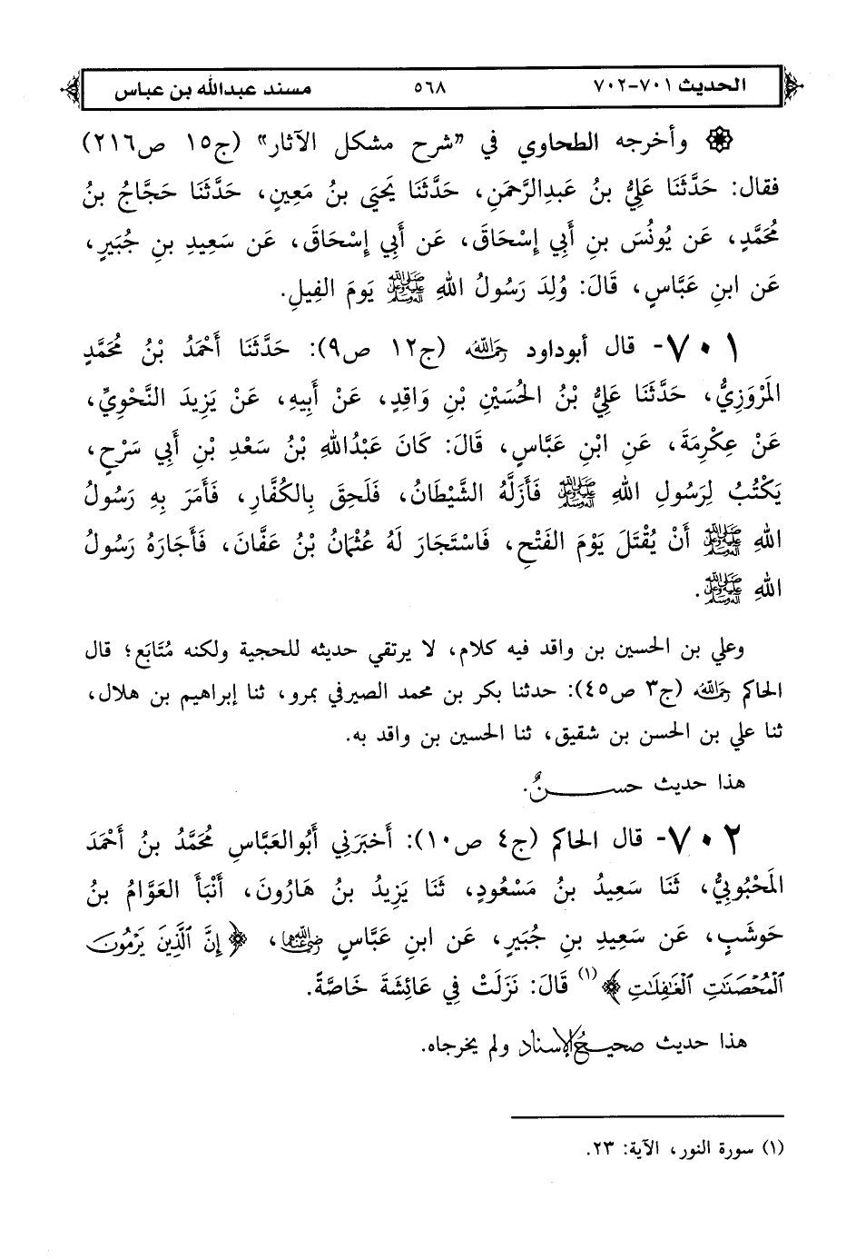 702 - قال الحاكم (ج 4 ص 10): أخبرني أبو العباس محمد بن أحمد المحبوبي، ثنا سعيد بن مسعود، ثنا يزيد بن هارون، أنبأ العوام بن حوشب، عن سعيد بن جبير، عن ابن عباس رضي الله عنهما {إن الذين يرمون المحصنات الغافلات} (1) قال: نزلت في عائشة خاصة.