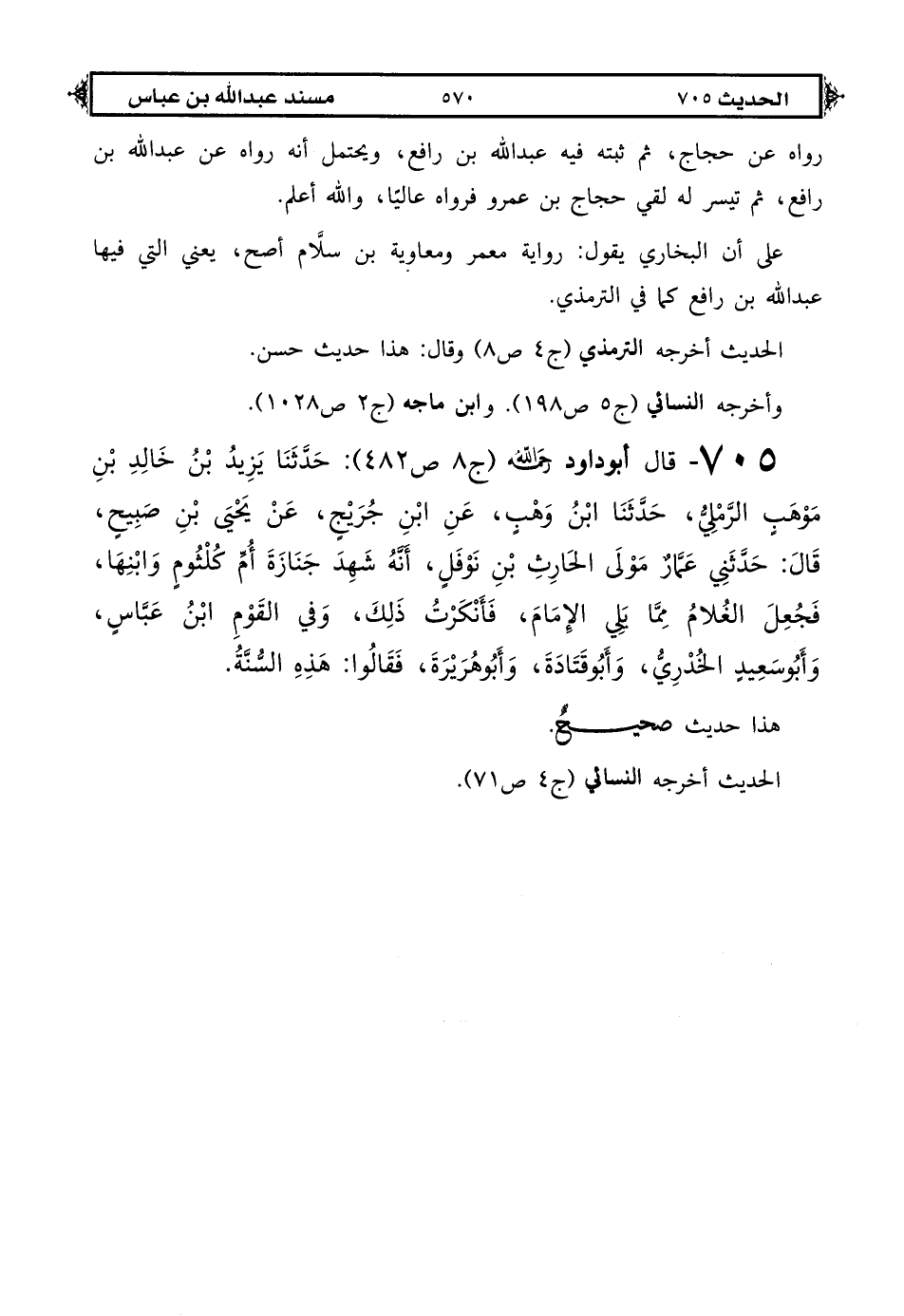 705 - قال أبو داود رحمه الله (ج 8 ص 482): حَدَّثَنَا يَزِيدُ بْنُ خَالِدِ بْنِ مَوْهَبٍ الرَّمْلِيُّ حَدَّثَنَا ابْنُ وَهْبٍ عَنْ ابْنِ جُرَيْجٍ عَنْ يَحْيَى بْنِ صَبِيحٍ قَالَ حَدَّثَنِي عَمَّارٌ مَوْلَى الْحَارِثِ بْنِ نَوْفَلٍ: أَنَّهُ شَهِدَ جَنَازَةَ أُمِّ كُلْثُومٍ وَابْنِهَا فَجُعِلَ الْغُلَامُ مِمَّا يَلِي الْإِمَامَ فَأَنْكَرْتُ ذَلِكَ وَفِي الْقَوْمِ ابْنُ عَبَّاسٍ وَأَبُو سَعِيدٍ الْخُدْرِيُّ وَأَبُو قَتَادَةَ وَأَبُو هُرَيْرَةَ فَقَالُوا: هَذِهِ السُّنَّةُ.