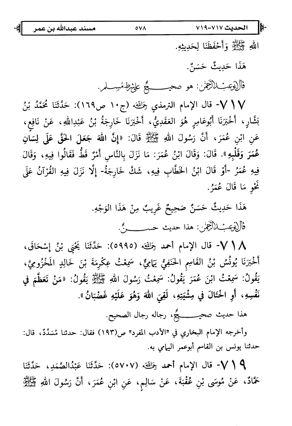 717 - قال الإمام الترمذي رحمه الله (ج 10 ص 169): حَدَّثَنَا مُحَمَّدُ بْنُ بَشَّارٍ أخبرَنَا أَبُو عَامِرٍ هو الْعَقَدِيُّ أخبرَنَا خَارِجَةُ بْنُ عَبْدِ اللهِ عَنْ نَافِعٍ عَنْ ابْنِ عُمَرَ: أَنَّ رَسُولَ اللهِ صَلَّى اللهُ عَلَيْهِ وَعَلَى آلِهِ وَسَلَّمَ قَالَ «إِنَّ اللهَ جَعَلَ الْحَقَّ عَلَى لِسَانِ عُمَرَ وَقَلْبِهِ». قال: وقَالَ ابْنُ عُمَرَ: مَا نَزَلَ بِالنَّاسِ أَمْرٌ قَطُّ فَقَالُوا فِيهِ وَقَالَ فِيهِ عُمَرُ -أَوْ قَالَ ابْنُ الْخَطَّابِ فِيهِ، شَكَّ خَارِجَةُ- إِلَّا نَزَلَ فِيهِ الْقُرْآنُ عَلَى نَحْوِ مَا قَالَ عُمَرُ.