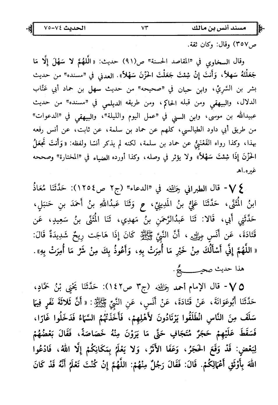 74 - قال الطبراني رحمه الله في "الدعاء" (ج 2 ص 1254): حدثنا معاذ بن المثنى، حدثنا علي بن المديني، ح وثنا عبد الله بن أحمد بن حنبل، حدثني أبي، قالا: ثنا عبد الرحمن بن مهدي، ثنا المثنى بن سعيد، عن قتادة، عن أنس رضي الله عنه: أن النبي صلى الله عليه وعلى آله وسلم كان إذا هاجت ريح شديدة قال: «اللهم إني أسألك من خير ما أمرت به، وأعوذ بك من شر ما أمرت به».