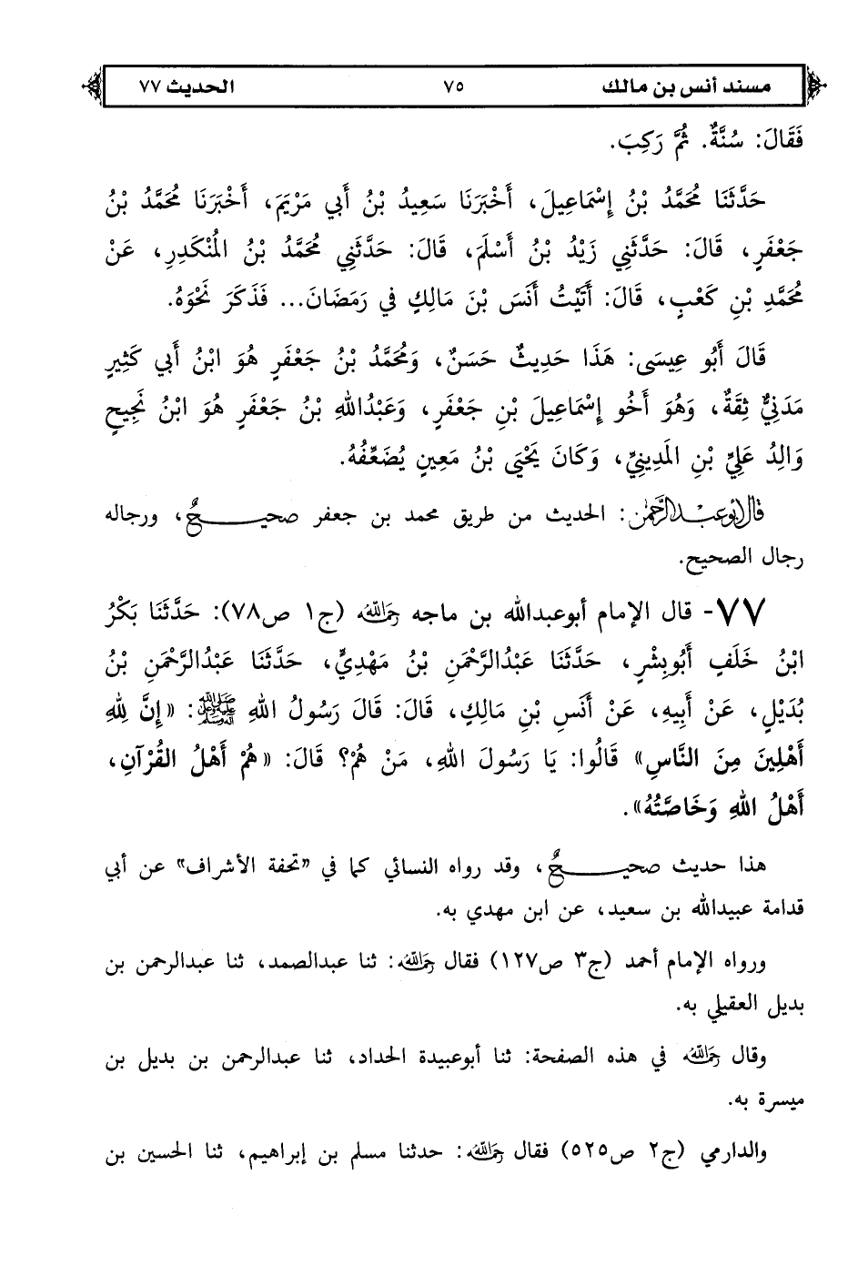 77 - قال الإمام أبو عبد الله بن ماجه رحمه الله (ج 1 ص 78): حَدَّثَنَا بَكْرُ بْنُ خَلَفٍ أَبُو بِشْرٍ حَدَّثَنَا عَبْدُ الرَّحْمَنِ بْنُ مَهْدِيٍّ حَدَّثَنَا عَبْدُ الرَّحْمَنِ بْنُ بُدَيْلٍ عَنْ أَبِيهِ عَنْ أَنَسِ بْنِ مَالِكٍ قَالَ: قَالَ رَسُولُ اللهِ صَلَّى اللهُ عَلَيْهِ وَعَلَى آلِهِ وَسَلَّمَ «إِنَّ لِلَّهِ أَهْلِينَ مِنْ النَّاسِ» قَالُوا يَا رَسُولَ اللهِ مَنْ هُمْ قَالَ «هُمْ أَهْلُ الْقُرْآنِ أَهْلُ اللهِ وَخَاصَّتُهُ».