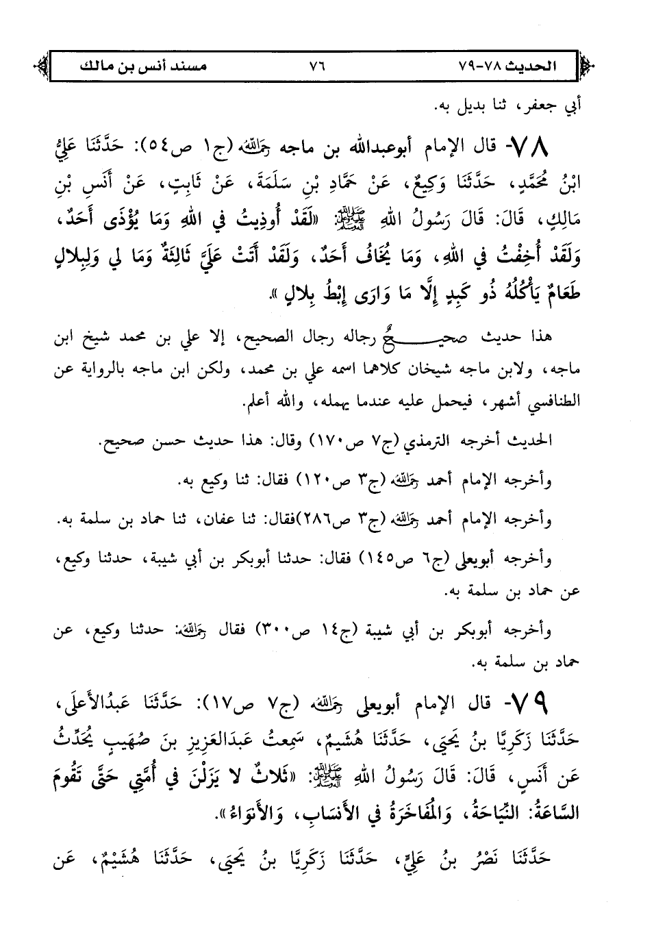 78 - قال الإمام أبو عبد الله بن ماجه رحمه الله (ج 1 ص 54): حَدَّثَنَا عَلِيُّ بْنُ مُحَمَّدٍ حَدَّثَنَا وَكِيعٌ عَنْ حَمَّادِ بْنِ سَلَمَةَ عَنْ ثَابِتٍ عَنْ أَنَسِ بْنِ مَالِكٍ قَالَ: قَالَ رَسُولُ اللهِ صَلَّى اللهُ عَلَيْهِ وَعَلَى آلِهِ وَسَلَّمَ «لَقَدْ أُوذِيتُ فِي اللهِ وَمَا يُؤْذَى أَحَدٌ وَلَقَدْ أُخِفْتُ فِي اللهِ وَمَا يُخَافُ أَحَدٌ وَلَقَدْ أَتَتْ عَلَيَّ ثَالِثَةٌ وَمَا لِي وَلِبِلَالٍ طَعَامٌ يَأْكُلُهُ ذُو كَبِدٍ إِلَّا مَا وَارَى إِبِطُ بِلَالٍ».