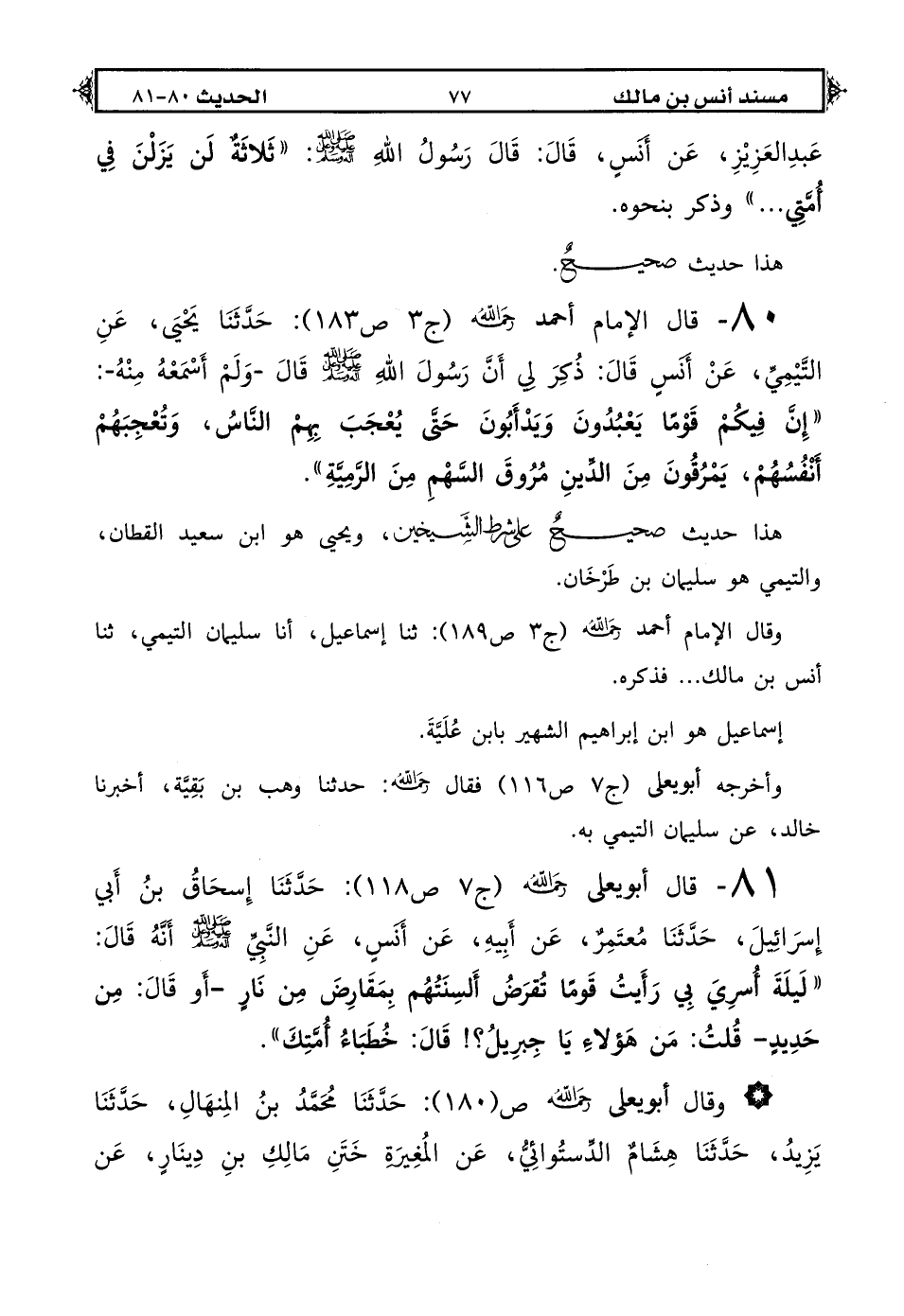 80 - قال الإمام أحمد رحمه الله (ج 3 ص 183): حدثنا يحيى عن التيمي عن أنس قال: ذكر لي أن رسول الله صلى الله عليه وعلى آله وسلم قال ولم أسمعه منه «إن فيكم قومًا يعبدون ويدأبون حتى يعجب بهم الناس وتعجبهم أنفسهم يمرقون من الدين مروق السهم من الرمية».