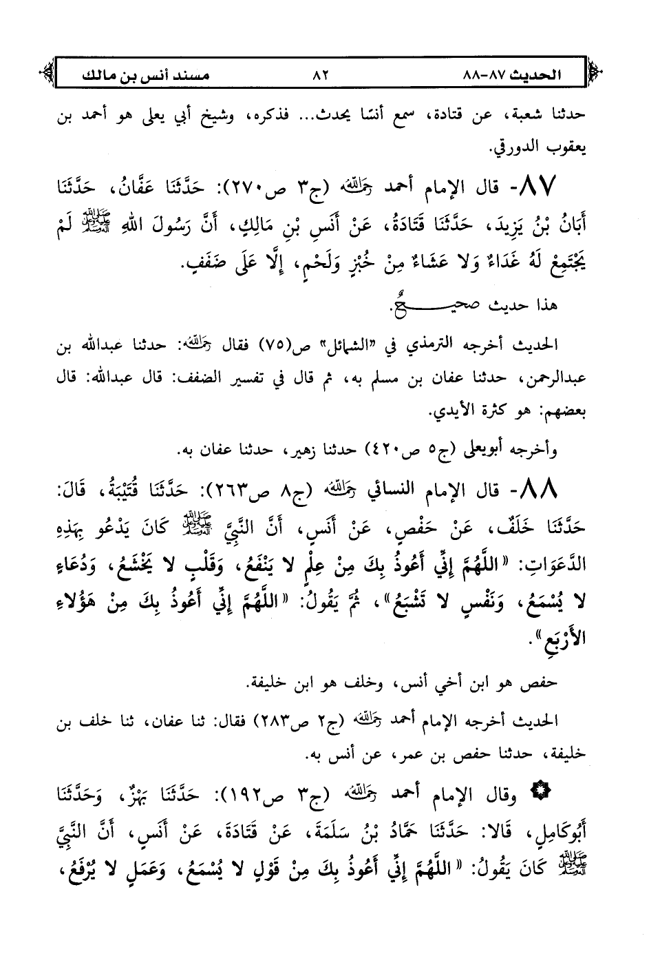 87 - قال الإمام أحمد رحمه الله (ج 3 ص 270): حدثنا عفان حدثنا أبان بن يزيد حدثنا قتادة عن أنس بن مالك: أن رسول الله صلى الله عليه وعلى آله وسلم لم يجتمع له غداء ولا عشاء من خبز ولحم إلا على ضفف.