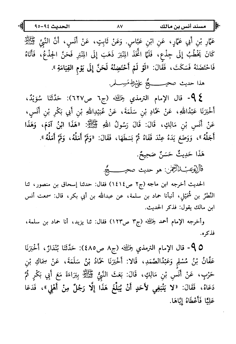 94 - قال الإمام الترمذي رحمه الله (ج 6 ص 627): حَدَّثَنَا سُوَيْدُ بْنُ نَصْرٍ أَخْبَرَنَا عَبْدُ اللهِ عَنْ حَمَّادِ بْنِ سَلَمَةَ عَنْ عُبَيْدِ اللهِ بْنِ أَبِي بَكْرِ بْنِ أَنَسٍ عَنْ أَنَسِ بْنِ مَالِكٍ قَالَ: قَالَ رَسُولُ اللهِ صَلَّى اللهُ عَلَيْهِ وَعَلَى آلِهِ وَسَلَّمَ «هَذَا ابْنُ آدَمَ وَهَذَا أَجَلُهُ» وَوَضَعَ يَدَهُ عِنْدَ قَفَاهُ ثُمَّ بَسَطَهَا فَقَالَ «وَثَمَّ أَمَلُهُ وَثَمَّ أَمَلُهُ».
