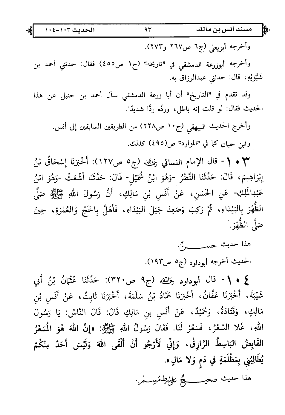 104 - قال أبو داود رحمه الله (ج 9 ص 320): حَدَّثَنَا عُثْمَانُ بْنُ أَبِي شَيْبَةَ أخبرَنَا عَفَّانُ أخبرَنَا حَمَّادُ بْنُ سَلَمَةَ أَخْبَرَنَا ثَابِتٌ عَنْ أَنَسِ بْنِ مَالِكٍ وَقَتَادَةُ وَحُمَيْدٌ عَنْ أَنَسٍ بْنِ مَالِكٍ قَالَ: قَالَ النَّاسُ يَا رَسُولَ اللهِ غَلَا السِّعْرُ فَسَعِّرْ لَنَا فَقَالَ رَسُولُ اللهِ صَلَّى اللهُ عَلَيْهِ وَعَلَى آلِهِ وَسَلَّمَ «إِنَّ اللهَ هُوَ الْمُسَعِّرُ الْقَابِضُ الْبَاسِطُ الرَّازِقُ وَإِنِّي لَأَرْجُو أَنْ أَلْقَى اللهَ وَلَيْسَ أَحَدٌ مِنْكُمْ يُطَالِبُنِي بِمَظْلَمَةٍ فِي دَمٍ وَلَا مَالٍ».