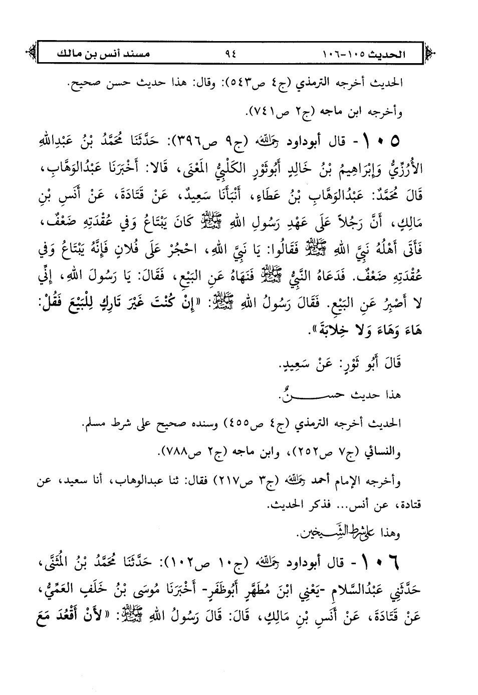 105 - قال أبو داود (ج 9 ص 396): حَدَّثَنَا مُحَمَّدُ بْنُ عَبْدِ اللهِ الْأُرُزِّيُّ وَإِبْرَاهِيمُ بْنُ خَالِدٍ أَبُو ثَوْرٍ الْكَلْبِيُّ الْمَعْنَى قَالَا أخبرَنَا عَبْدُ الْوَهَّابِ -قَالَ مُحَمَّدٌ: عَبْدُ الْوَهَّابِ بْنُ عَطَاءٍ- أَنبأَنَا سَعِيدٌ عَنْ قَتَادَةَ عَنْ أَنَسِ بْنِ مَالِكٍ: أَنَّ رَجُلًا عَلَى عَهْدِ رَسُولِ اللهِ صَلَّى اللهُ عَلَيْهِ وَعَلَى آلِهِ وَسَلَّمَ كَانَ يَبْتَاعُ وَفِي عُقْدَتِهِ ضَعْفٌ فَأَتَى أَهْلُهُ نَبِيَّ اللهِ صَلَّى اللهُ عَلَيْهِ وَعَلَى آلِهِ وَسَلَّمَ فَقَالُوا يَا نَبِيَّ اللهِ احْجُرْ عَلَى فُلَانٍ فَإِنَّهُ يَبْتَاعُ وَفِي عُقْدَتِهِ ضَعْفٌ فَدَعَاهُ النَّبِيُّ صَلَّى اللهُ عَلَيْهِ وَعَلَى آلِهِ وَسَلَّمَ فَنَهَاهُ عَنْ الْبَيْعِ فَقَالَ يَا رَسُولَ اللهِ إِنِّي لَا أَصْبِرُ عَنْ الْبَيْعِ فَقَالَ رَسُولُ اللهِ صَلَّى اللهُ عَلَيْهِ وَعَلَى آلِهِ وَسَلَّمَ «إِنْ كُنْتَ غَيْرَ تَارِكٍ الْبَيْعَ فَقُلْ هَاءَ وَهَاءَ وَلَا خِلَابَةَ».