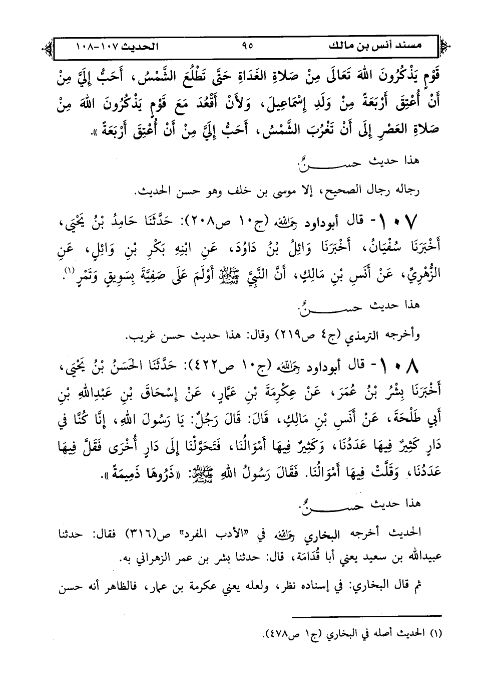 107 - قال أبو داود رحمه الله (ج 10 ص 208): حَدَّثَنَا حَامِدُ بْنُ يَحْيَى أخبرَنَا سُفْيَانُ اخبرَنَا وَائِلُ بْنُ دَاوُدَ عَنْ ابْنِهِ بَكْرِ بْنِ وَائِلٍ عَنْ الزَّهْرِيِّ عَنْ أَنَسِ بْنِ مَالِكٍ: أَنَّ النَّبِيَّ صَلَّى اللهُ عَلَيْهِ وَعَلَى آلِهِ وَسَلَّمَ أَوْلَمَ عَلَى صَفِيَّةَ بِسَوِيقٍ وَتَمْرٍ. (1)