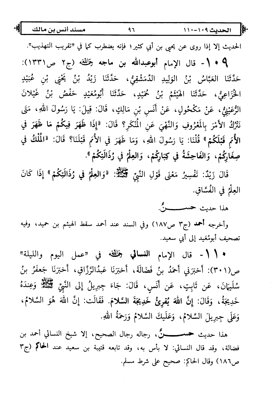 109 - قال الإمام أبو عبد الله بن ماجه رحمه الله (ج 2 ص 1331): حَدَّثَنَا الْعَبَّاسُ بْنُ الْوَلِيدِ الدِّمَشْقِيُّ حَدَّثَنَا زَيْدُ بْنُ يَحْيَى بْنِ عُبَيْدٍ الْخُزَاعِيُّ حَدَّثَنَا الْهَيْثَمُ بْنُ حُمَيْدٍ حَدَّثَنَا أَبُو مُعَيْدٍ حَفْصُ بْنُ غَيْلَانَ الرُّعَيْنِيُّ عَنْ مَكْحُولٍ عَنْ أَنَسِ بْنِ مَالِكٍ قَالَ: قِيلَ يَا رَسُولَ اللهِ مَتَى نَتْرُكُ الْأَمْرَ بِالْمَعْرُوفِ وَالنَّهْيَ عَنْ الْمُنْكَرِ قَالَ «إِذَا ظَهَرَ فِيكُمْ مَا ظَهَرَ فِي الْأُمَمِ قَبْلَكُمْ» قُلْنَا يَا رَسُولَ اللهِ وَمَا ظَهَرَ فِي الْأُمَمِ قَبْلَنَا قَالَ «الْمُلْكُ فِي صِغَارِكُمْ وَالْفَاحِشَةُ فِي كِبَارِكُمْ وَالْعِلْمُ فِي رُذَالَتِكُمْ».