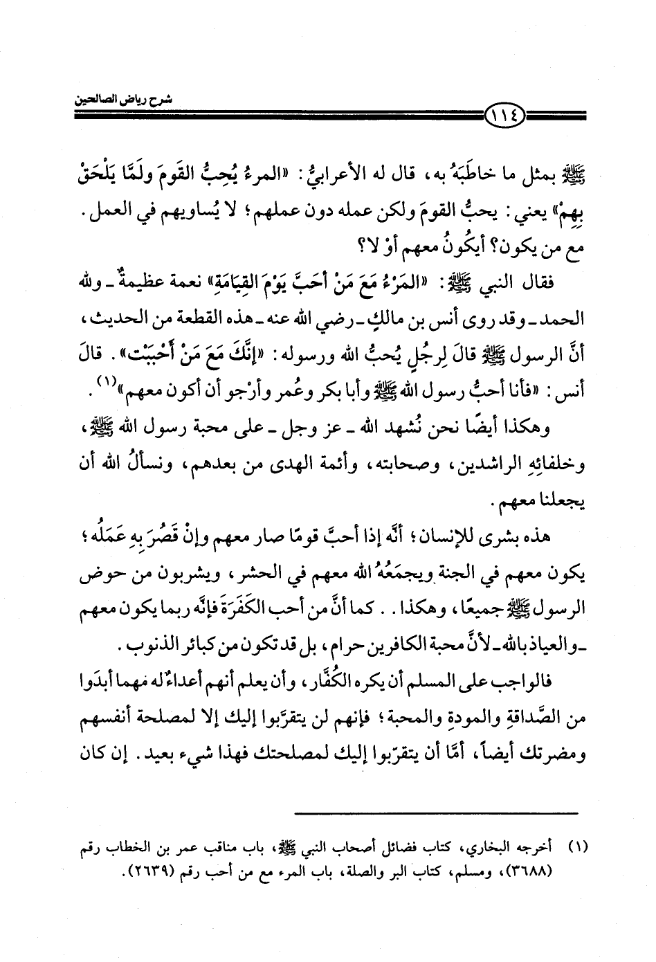 فقال النبي صلي الله عليه وسلم: ((المرء مع من أحب يوم القيامة)) نعمة عظيمة - ولله الحمد- وقد روي أنس بن مالك- رضي الله عنه- هذه القطعة من الحديث، أن الرسول صلي الله عليه وسلم قال لرجل يحب الله ورسوله: ((إنك مع من أحببت)) قال أنس: ((فأنا أحب رسول الله صلي الله عليه وسلم وأبابكر عمر وأرجو أن أكون معهم)) .