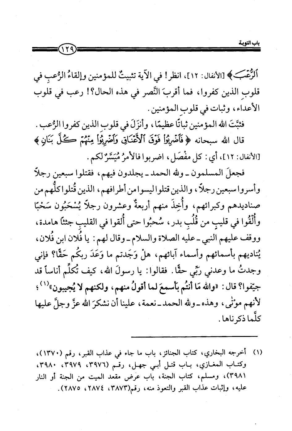 فجعل المسلمون- ولله الحمد- يجلدون فيهم؛ فقتلوا سبعين رجلاً واسروا سبعين رجلاً، والذين قتلوا ليسوا من أطرفهم، الذين قتلوا كلهم من صناديهم وكبرائهم، وأخذ منهم أربعة وعشرون رجلاً يسحبون سحباً وألقوا في قليب من قلب بدر، سحبوا حتى ألقوا في القليب جثثاً هامدة، ووقف عليهم النبي - عليه الصلاة والسلام_ وقال لهم: يا فلان ابن فلان، يناديهم بأسمائهم وأسماء آبائهم، هل وجدتم ما وعد ربكم حقا؟ فإني وجدت ما وعدني ربي حقا. فقالوا: يا رسول الله، كيف تكلم أناساً قد جيفوا؟ قال: ((والله ما أنتم بأسمع لما أقول منهم، ولكنهم لا يجيبون)) ؛ لأنهم موتي، وهذه - ولله الحمد- نعمة، علينا أن نشكر الله عز وجل عليها كلما ذكرناها.
