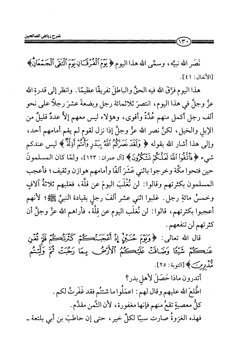 هذا اليوم فرق الله فيه الحق والباطل تفريقاً عظيماً. وانظر إلي قدرة الله عز وجل في هذا اليوم، انتصر ثلاثمائة رجل وبضعة عشر رجلاً على نحو ألف رجل أكمل منهم عدة وأقوي، وهؤلاء ليس معهم إلا عد قليل من الإبل والخيل، لكن نصر الله عز وجل إذا نزل لقوم لم يقم أمامهم أحد، وإلي هذا أشار الله بقوله) وَلَقَدْ نَصَرَكُمُ اللَّهُ بِبَدْرٍ وَأَنْتُمْ أَذِلَّةٌ) (آل عمران: من الآية123) ، ولما كان المسلمون حين فتحوا مكة وخرجوا باثني عشر ألفاً وأمامهم هوزان وثقيف؛ فأعجب المسلمون بكثرتهم وقالوا: لن نغلب اليوم عن قلة، فغلبهم ثلاثة آلاف وخمس مائة رجل. غلبوا اثني عشر ألف رجل بقيادة النبي صلي الله عليه وسلم، لنهم أعجبوا بكثرتهم، قالوا: لن نغلب اليوم عن قله، فأراهم الله عز وجل أن كثرتهم لن تنفعهم.