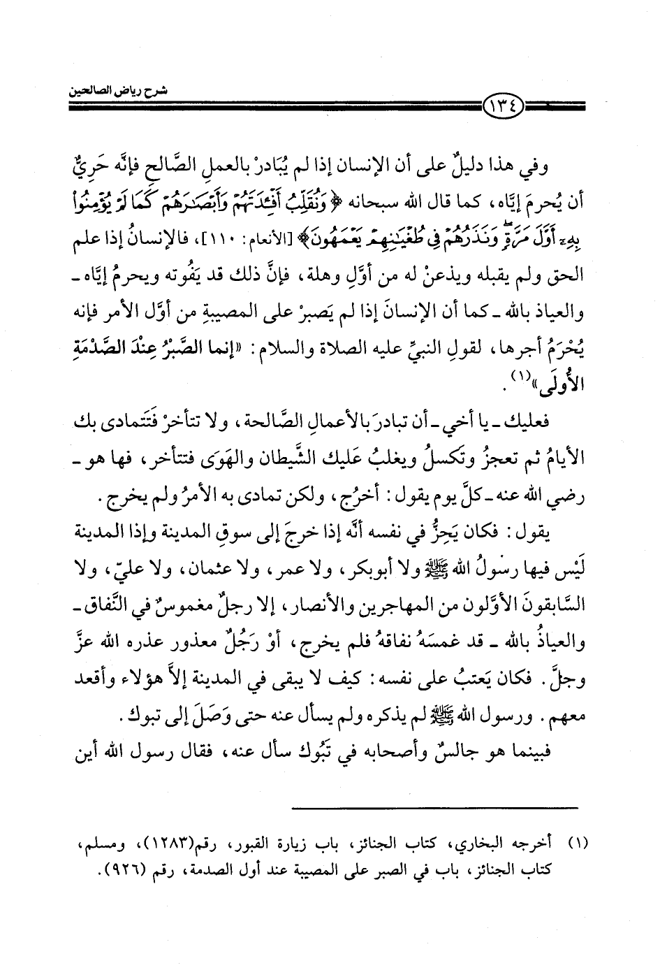 فعليك- يا أخي - أن تبادر بالأعمال الصالحة، ولا تتأخر فتتمادي بك الأيام ثم تعجز وتكسل ويغلب عليك الشيطان والهوى فتتأخر، فها هو- رضي الله عنه- كل يوم يقول: أخرج، ولكن تمادي به الأمر ولم يخرج.