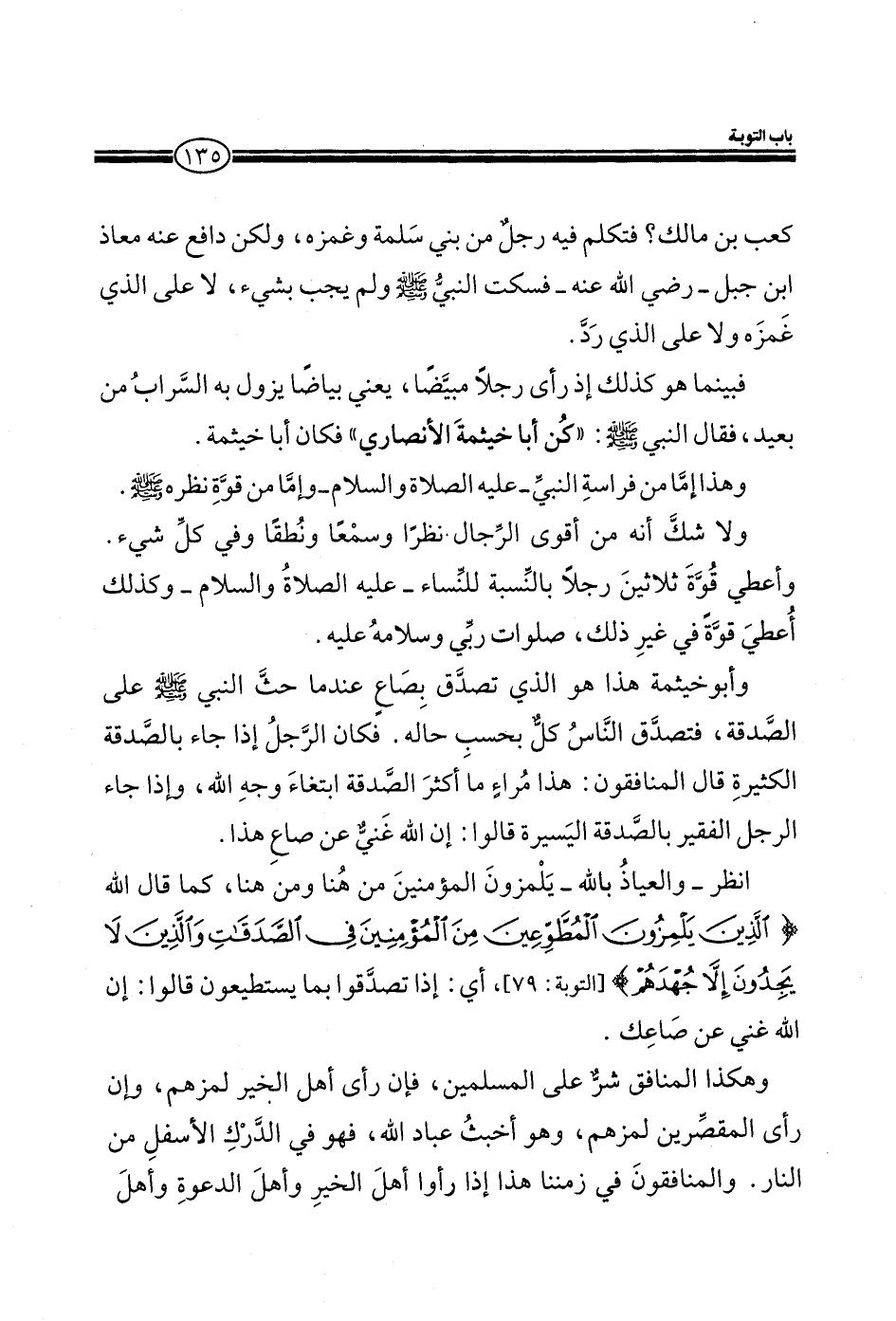 وأبو خثيمة هذا هو الذي تصدق بصاع عندما حث النبي صلي الله عليه وسلم علي الصدقة، فتصدق الناس كل بحسب حاله. فكان الرجل إذا جاء بالصدقة الكثيرة قال المنافقون: هذا مراء ما أكثر الصداقة ابتغاء وجه الله، وإذا جاء الرجل الفقير بالصدقة اليسيرة قالوا: إن الله غني عن صاع هذا.