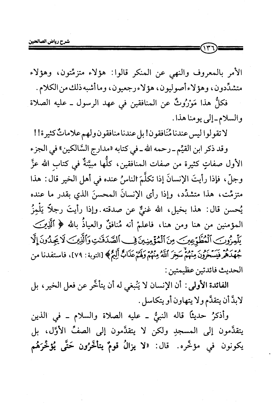 وقد ذكر ابن القيم- رحمه اله- في كتابه ((مدارج السالكين)) في الجزء الأول صفات كثيرة من صفات المنافقين، كلها مبينة في كتاب الله عز وجل متزمت، هذا بخيل، لله غني عن صدقته. وإذا رأيت رجلاً يلمز المؤمنين من هنا ومن هنا، فاعلم أنه منافق والعياذ بالله) الَّذِينَ يَلْمِزُونَ الْمُطَّوِّعِينَ مِنَ الْمُؤْمِنِينَ فِي الصَّدَقَاتِ وَالَّذِينَ لا يَجِدُونَ إِلَّا جُهْدَهُمْ فَيَسْخَرُونَ مِنْهُمْ سَخِرَ اللَّهُ مِنْهُمْ وَلَهُمْ عَذَابٌ أَلِيمٌ) (التوبة: 79)) الَّذِينَ يَلْمِزُونَ الْمُطَّوِّعِينَ مِنَ الْمُؤْمِنِينَ فِي الصَّدَقَاتِ وَالَّذِينَ لا يَجِدُونَ إِلَّا جُهْدَهُمْ فَيَسْخَرُونَ مِنْهُمْ سَخِرَ اللَّهُ مِنْهُمْ وَلَهُمْ عَذَابٌ أَلِيمٌ) (التوبة: 79)) الَّذِينَ يَلْمِزُونَ الْمُطَّوِّعِينَ مِنَ الْمُؤْمِنِينَ فِي الصَّدَقَاتِ وَالَّذِينَ لا يَجِدُونَ إِلَّا جُهْدَهُمْ فَيَسْخَرُونَ مِنْهُمْ سَخِرَ اللَّهُ مِنْهُمْ وَلَهُمْ عَذَابٌ أَلِيمٌ) (التوبة: 79) فاستفدنا من الحديث فائدتين عظيمتين: