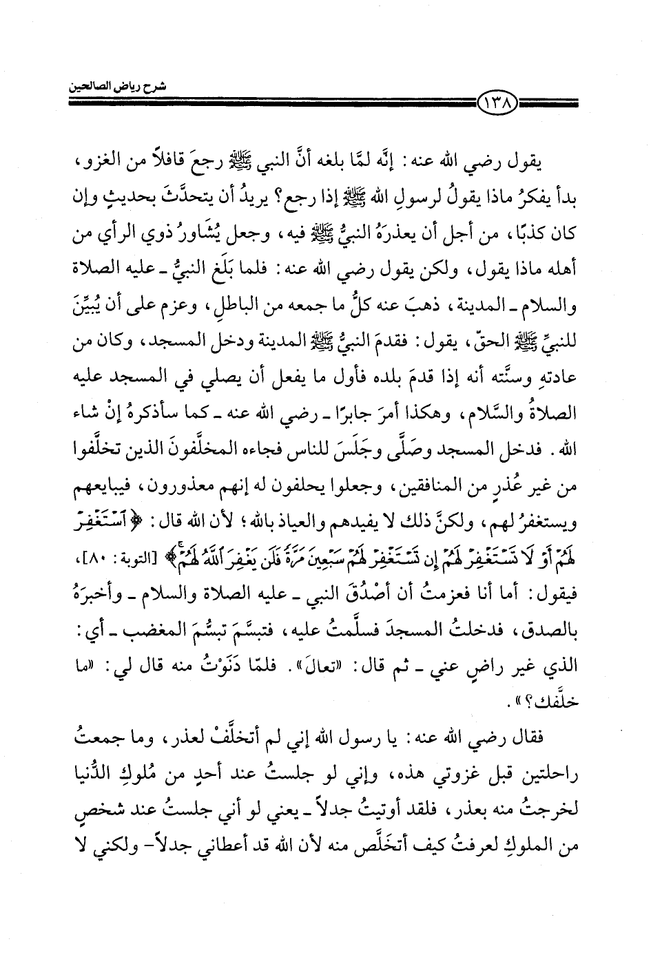 يقول رضي الله عنه: إنه لما بلغه أن النبي صلي الله عليه وسلم رجع قافلاً من الغزو، بدأ يفكر ماذا يقول لرسول الله صلي الله عليه وسلم إذا رجع؟ يريد أن يتحدث بحديث وإن كان كذباَ، من أجل أن يعذره النبي صلي الله عليه وسلم فيه، وجعل يشاور ذوي الرأي من أهله ماذا يقول، ولكن يقول رضي الله عنه: فلما بلغ من الباطل، وعزم على أن يبين للنبي صلي الله عليه وسلم الحق، يقول: فقدم النبي صلي الله عليه وسلم المدينة ودخل المسجد، وكان من عادته وسنته أنه إذا قدم بلده فأول ما يفعل أن يصلي في المسجد عليه الصلاة والسلام، وهكذا أمر جابراً-رضي الله عنه- كما سأذكره إن شاء الله، فدخل المسجد وصلي وجلس للناس فجاءه المخلفون الذين تخلفوا من غير عذر من المنافقين، وجعلوا يحلفون له إنهم معذورون، فبايعهم ويستغفر لهم ولكن ذلك لا يفيدهم والعياذ بالله؛ لأن الله قال:) اسْتَغْفِرْ لَهُمْ أَوْ لا تَسْتَغْفِرْ لَهُمْ إِنْ تَسْتَغْفِرْ لَهُمْ سَبْعِينَ مَرَّةً فَلَنْ يَغْفِرَ اللَّهُ لَهُمْ) (التوبة: من الآية80) ، فيقول: أما أنا فعزمت أن اصدق النبي - عليه الصلاة والسلام_ وأخبره بالصدق، فدخلت المسجد فسلمت عليه، فتبسم تبسم المغضب- أي: