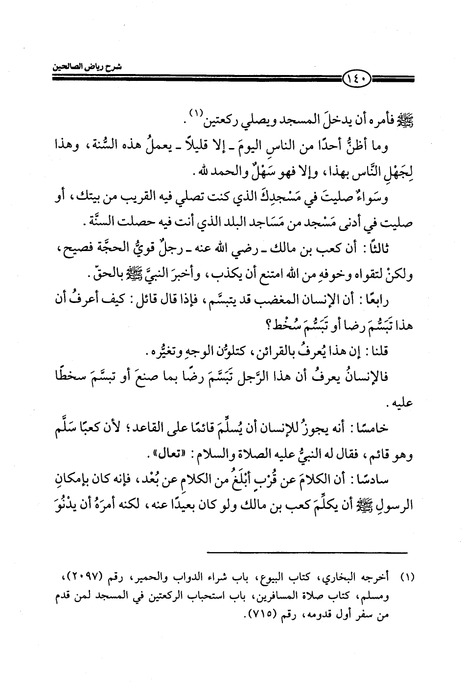 خامساً: أنه يجوز للإنسان أن يسلم قائماً علي القاعد؛ لأن كعبا سلم وهو قائم، فقال له النبي عليه الصلاة والسلام: ((تعال)) .