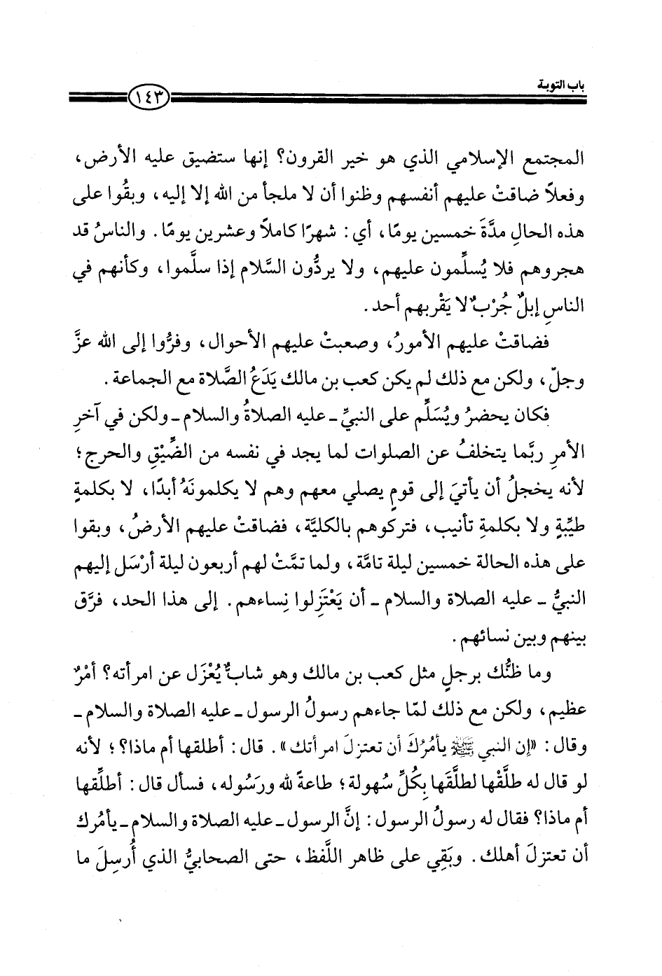 المجتمع الإسلامي الذي هو خير القرون؟ إنها ستضيق عليه الأرض، وفعلاً ضاقت عليهم أنفسهم وظنوا أن لا ملجأ من الله إلا إليه، وبقوا علي هذه الحال مدة خمسين يوماً، أي: شهراً كاملاً وعشرين يوماً. والناس قد هجروهم فلا يسلمون عليهم. ولا يردون السلام إذا سلموا. وكأنهم في الناس لإبل جرب لا يقربهم أحد.
