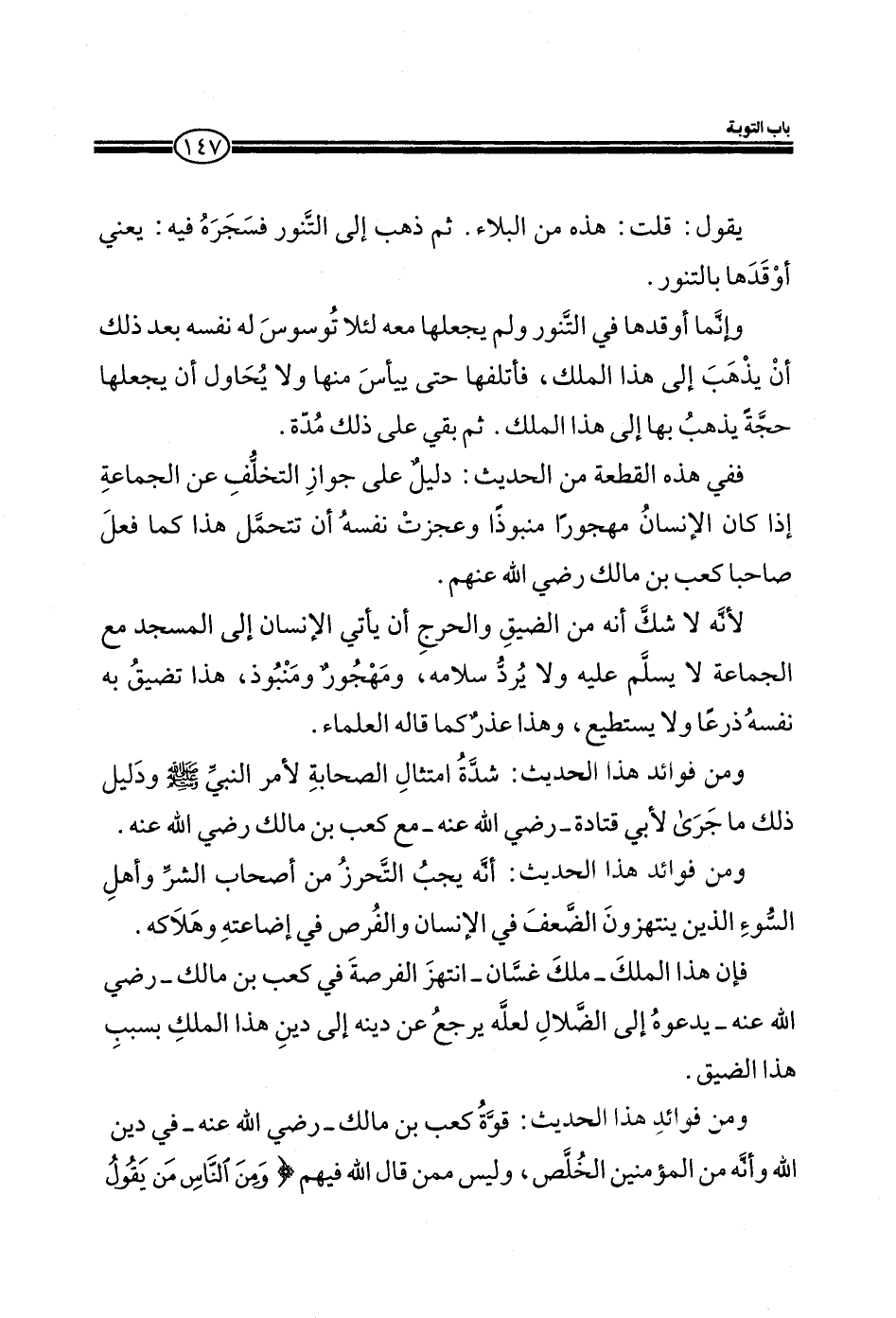 ففي هذه القطعة من الحديث: دليل على جواز التخلف عن الجماعة إذا كان الإنسان مهجوراً منبوذا وعجزت نفسه أن تتحمل هذا كما فعل صاحبا كعب بن مالك رضي الله عنهم.