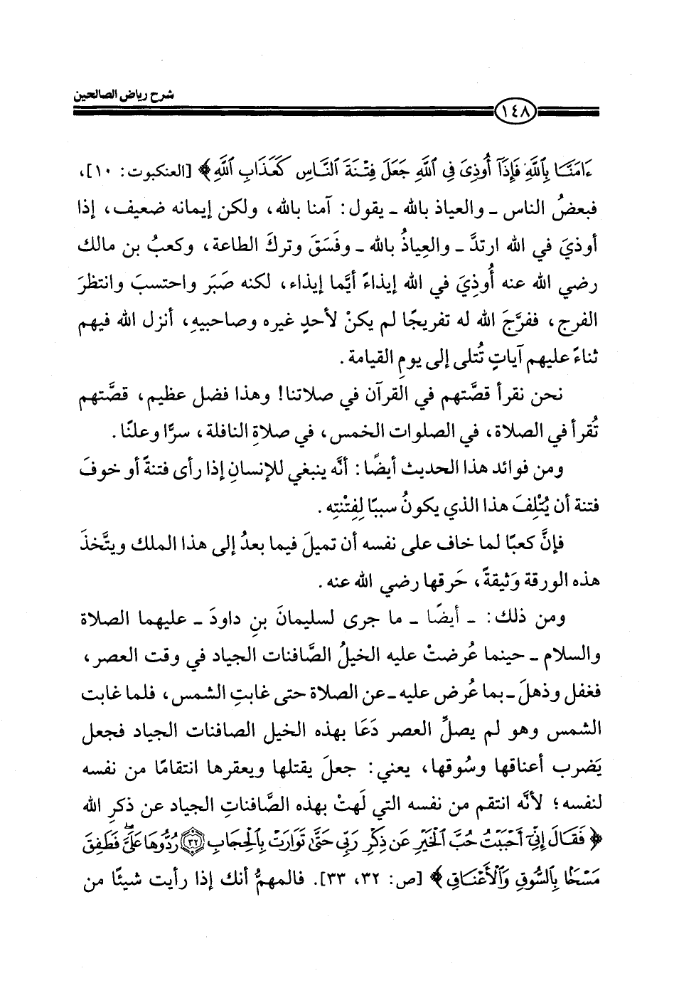 ومن ذلك: - أيضاً ما جري لسيلمان بن داود- عليهما الصلاة والسلام- حينما عرضت عليه الخيل الصافنات الجياد في وقت العصر، فغفل وذهل- بما عرض عليه- عن الصلاة حتى غابت الشمس، فلما غابت الشمس وهو لم يصل العصر دعا بهذه الخيل الصافنات الجياد فجعل يضرب أعناقها وسوقها، يعني: جعل يقتلها ويعقرها انتقاماً من نفسه لنفسه، لأنه انتقم من نفسه التي لهت بهذه الصافنات الجياد عن ذكر الله) فَقَالَ إِنِّي أَحْبَبْتُ حُبَّ الْخَيْرِ عَنْ ذِكْرِ رَبِّي حَتَّى تَوَارَتْ بِالْحِجَابِ) (صّ: 32)) فَقَالَ إِنِّي أَحْبَبْتُ حُبَّ الْخَيْرِ عَنْ ذِكْرِ رَبِّي حَتَّى تَوَارَتْ بِالْحِجَابِ) (صّ: 32)) رُدُّوهَا عَلَيَّ فَطَفِقَ مَسْحاً بِالسُّوقِ وَالْأَعْنَاقِ) (رُدُّوهَا عَلَيَّ فَطَفِقَ مَسْحاً بِالسُّوقِ وَالْأَعْنَاقِ) (صّ: 32/33) . فالمهم أنك إذا رأيت شيئاً من