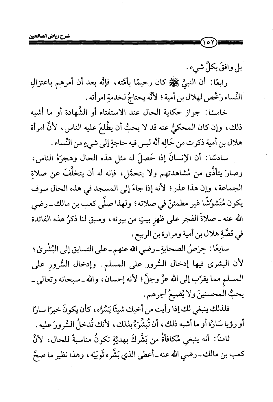 ثامناً: أنه ينبغي مكافأة من بشرك بهديه تكون مناسبة للحال، لأن كعب بن مالك- رضي الله عنه- أعطي الذي بشره ثوبيه، وهذا نظير ما صح