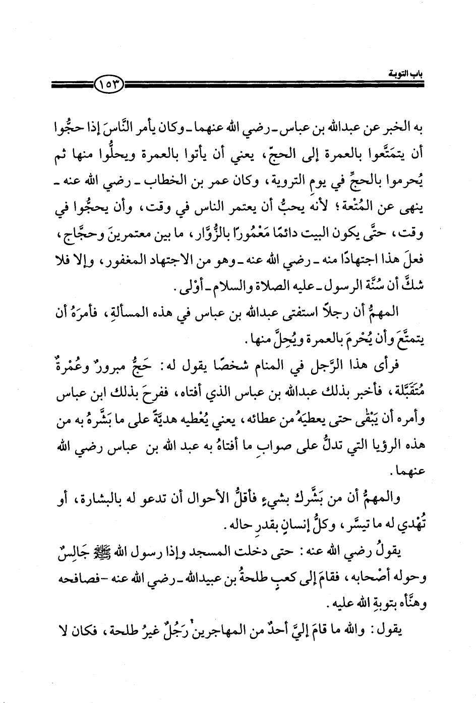 به الخبر عن عبد الله بن عباس- رضي الله عنهما- وكان يأمر الناس إذا حجوا أن يتمتعوا بالعمرة إلي الحج، يعني ان يأتوا بالعمرة ويحلوا منها ثم يحرموا بالحج في يوم التروية، وكان عمر بن الخطاب- رضي الله عنه- ينهي عن المتعة؛ لأنه يحب ان يعتمر الناس في وقت، وأن يحجوا في وقت، حتى يكون البيت دائماً معموراً بالزوار، ما بين معتمرين وحجاج، فعل هذا اجتهاداً منه- رضي الله عنه- وهو من الاجتهاد المغفور، وإلا فلا شك أن سنة الرسول - عليه الصلاة والسلام - أولي.