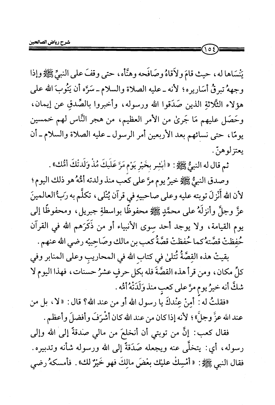 ينساها له، حيث قام ولاقاه وصافحه وهنأه، حتى وقف على النبي صلي الله عليه وسلم وإذا وجهه تبرق أساريره؛ لأنه- عليه الصلاة والسلام- سره أن يتوب الله على هؤلاء الثلاثة الذين صدقوا الله ورسوله، وأخبروا بالصدق عن إيمان، وحصل عليهم ما جري من الأمر العظيم، من هجر الناس لهم خمسين يوماً، حتى نسائهم بعد الأربعين أمر الرسول- عليه الصلاة والسلام- أن يعتزلوهن.