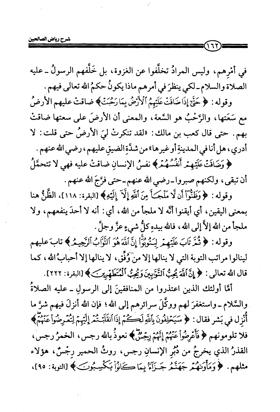 وقوله: (حَتَّى إِذَا ضَاقَتْ عَلَيْهِمُ الْأَرْضُ بِمَا رَحُبَتْ) ضاقت عليهم الأرض مع سعتها، والرحب هو السعة، والمعني ان الأرض علي سعتها ضاقت بهم. حتى قال كعب بن مالك: ((لقد تنكرت لي الأرض حتى قلت: لا أدري، هل أنا في المدينة أو غيرها)) من شدة الضيق عليهم، رضي الله عنهم.