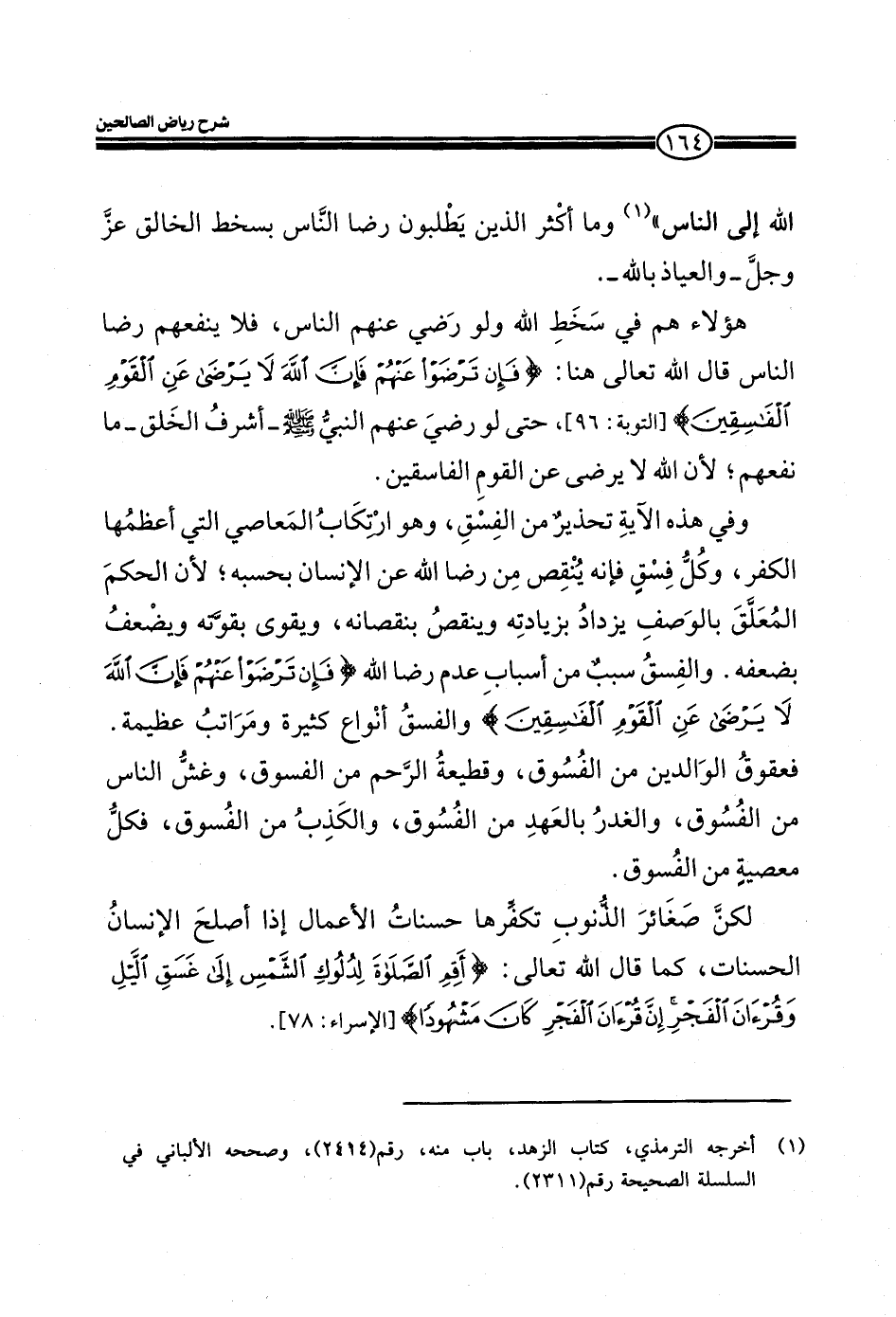 وفي هذه الآية تحذير من الفسق، وهو ارتكاب المعاصي التي أعظمها الكفر، وكل فسق فإنه ينقص من رضا الله عن الإنسان بحسبه، لأن الحكم المعلق بالوصف يزداد بزيادته وينقص بنقصانه، ويقوي بقوته ويضعف بضعفه. والفسق سبب من أسباب عدم رضا الله (فَإِنْ تَرْضَوْا عَنْهُمْ فَإِنَّ اللَّهَ لا يَرْضَى عَنِ الْقَوْمِ الْفَاسِقِينَ) والفسق أنواع كثيرة ومراتب عظيمة. فعقوق الوالدين من الفسوق، وقطيعة الرحم من الفسوق، والكذب من الفسوق، فكل معصية من الفسوق.