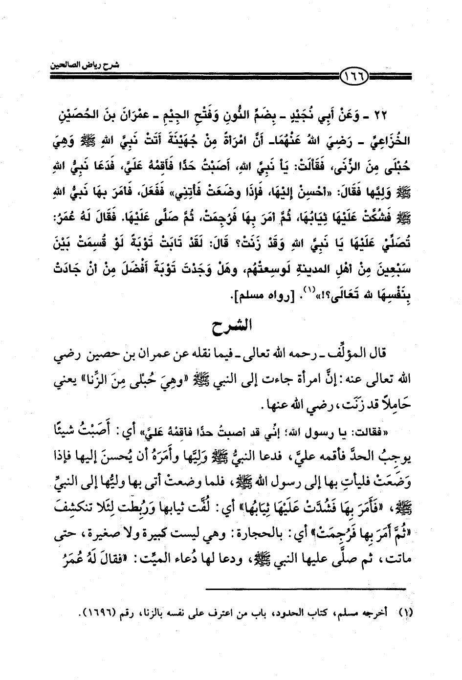 22- وعن أبي نجيد- بضم النون وفتح الجيم- عمران بن الحصين الخزاعي- رضي الله عنهما - أن امرأة من جهينة أتت نبي الله صلي الله عليه وسلم وهي حبلي من الزني، فقالت: يا نبي الله، أصبت حداً فأقمه علي، فدعا نبي الله صلي الله عليه وسلم وليها فقال: ((أحسن إليها، فإذا وضعت فأتني)) ففعل، فأمر بها نبي الله صلي الله عليه وسلم فشكت عليها ثيابها، ثم أمر بها فرجمت، ثم صلي عليها. فقال له عمر: تصلي عليها يا نبي الله وقد زنت؟ قال: لقد تابت توبة لو قسمت بين سبعين من أهل المدينة لوسعتهم، وهل وجدت توبة أفضل من أن جادت بنفسها لله تعالي؟!)) (رواه مسلم) .