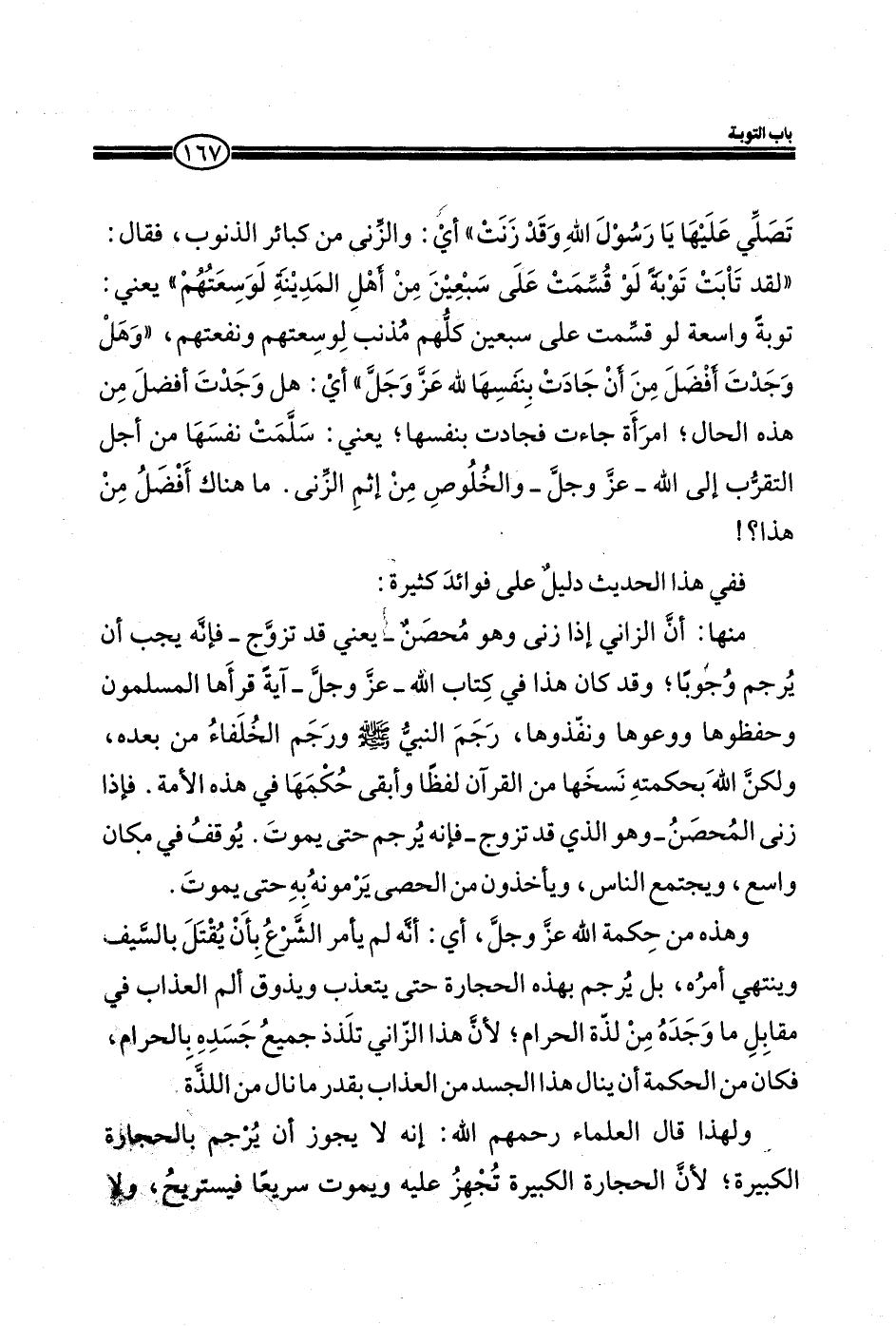 منها: أن الزاني إذا زني وهو محصن- يعني قد تزوج- فإنه يجب أن يرجم وجوباً؛ وقد كان هذا في كتاب الله- عز وجل- آية قرأها المسلمون وحفظوها ووعوها ونفذوها، رجم النبي صلي الله عليه وسلم ورجم الخلفاء من بعده، ولكن الله بحكمته نسخها من القرآن لفظاً وأبقي حكمها في هذه الأمة. فإذا زني المحصن- وهو الذي د تزوج - فإنه يرجم حتى يموت. يوقف في مكان واسع، ويجتمع الناس، ويأخذون من الحصي يرمونه به حتى يموت.