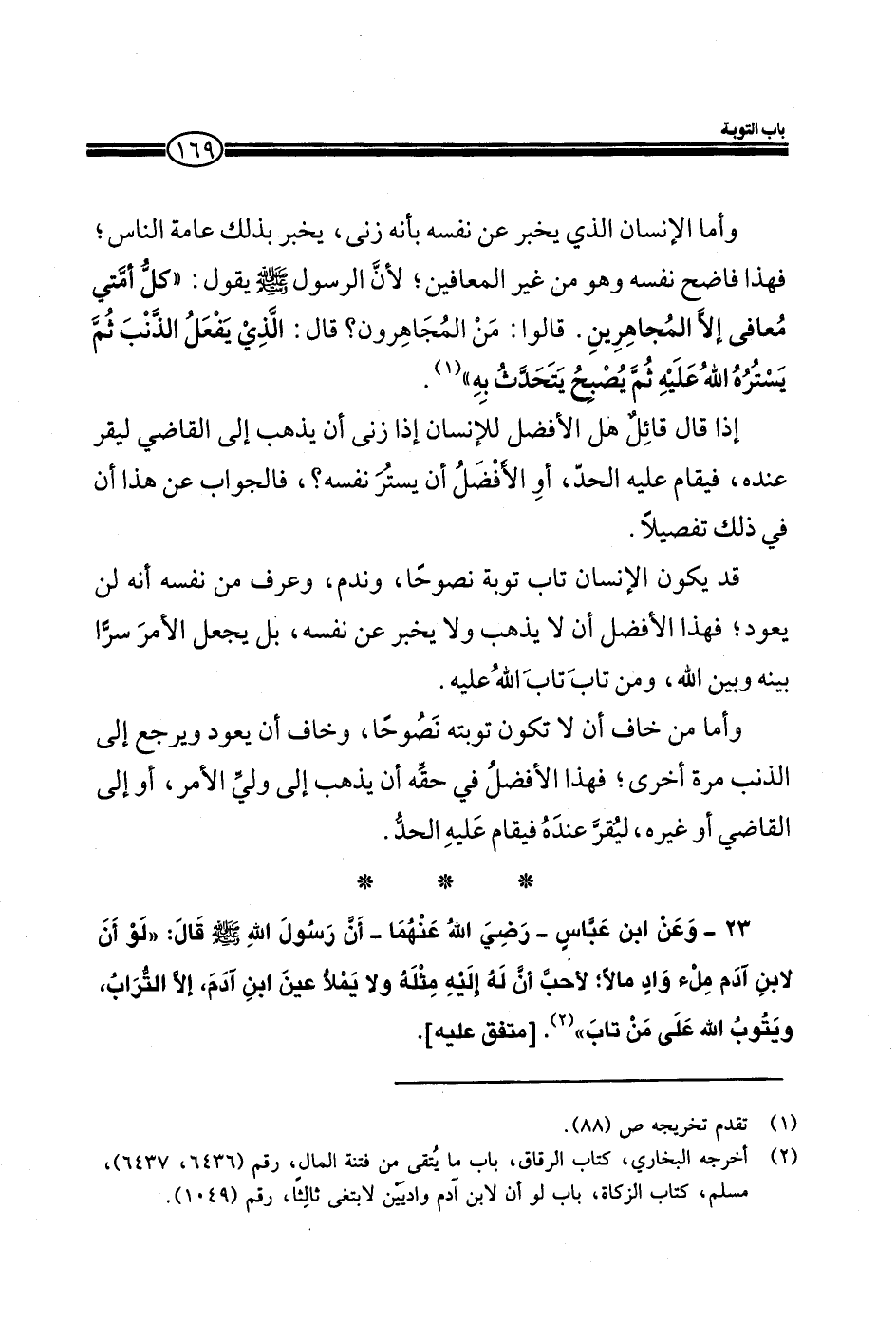 23- وعن ابن عباس -رضي الله عنهما- أن رسول الله صلي الله عليه وسلم قال: ((لو أن لابن آدم ملء واد مالاً: لأحب أن له إليه مثله ولا يملا عين ابن آدم إلا التراب، ويتوب الله على من تاب)) . (متفق عليه) .
